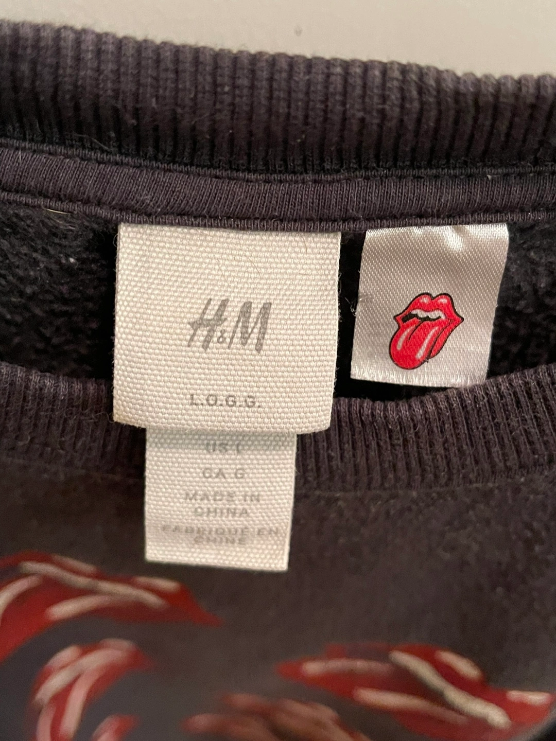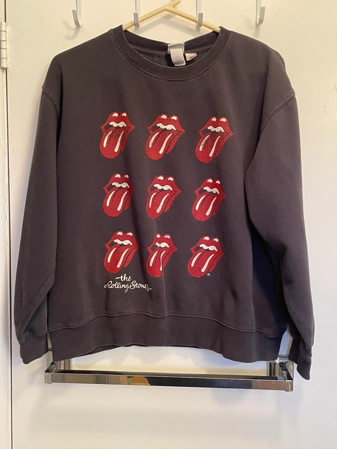 Dark grey crewneck sweatshirt. Features a repeating pattern of The Rolling Stones' iconic tongue logo. Long sleeves, relaxed fit. Very good condition with some fading. Made in China.