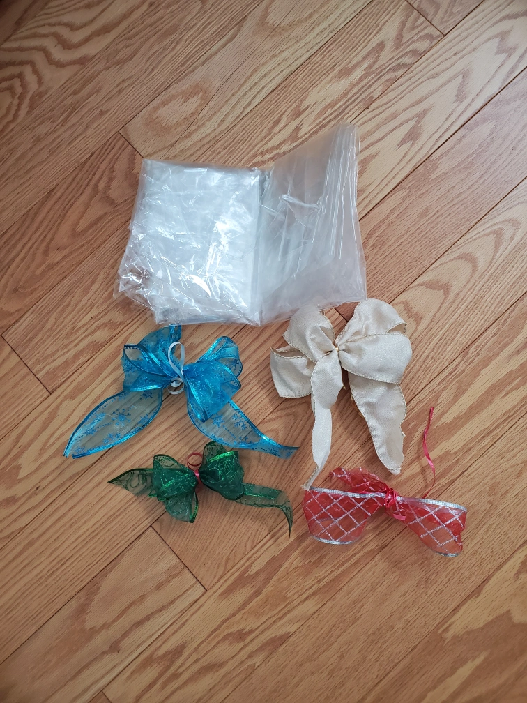 Bows, assorted colours and styles. Great for gift wrapping or crafting. Includes cellophane wrap.