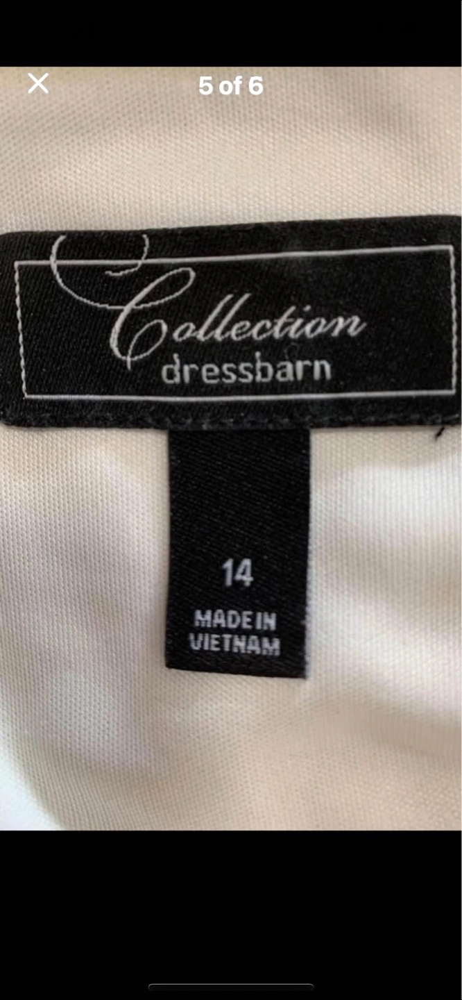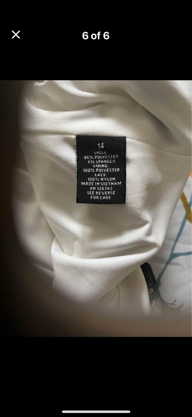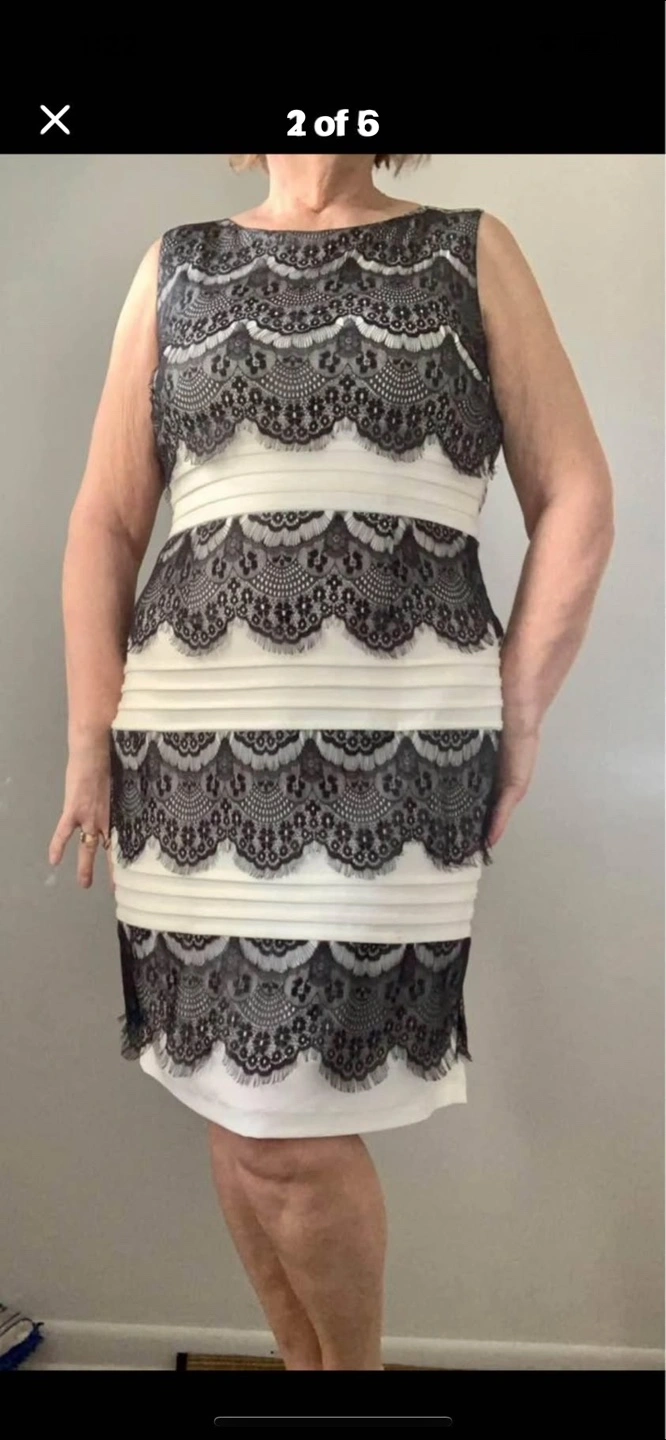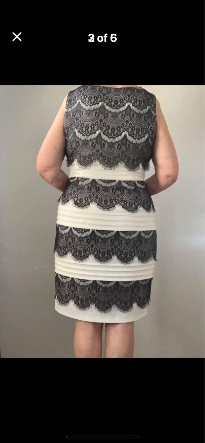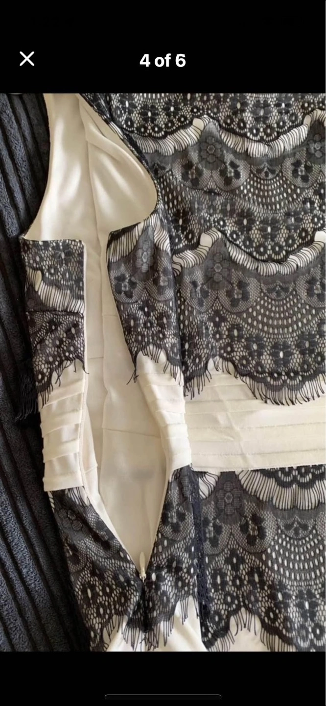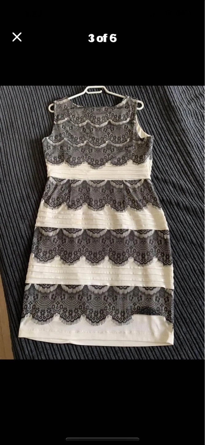 Elegant sleeveless dress. Black lace overlay on a cream background. Fitted silhouette. Knee-length. Side zipper closure. $20 Eastside