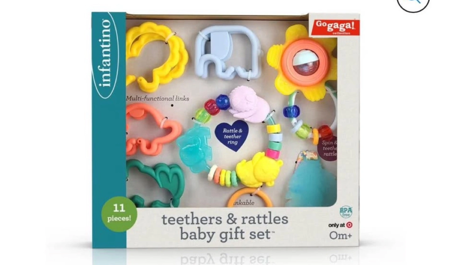 11-piece baby gift set. Includes teethers and rattles. Multi-functional links, rattle & teether ring, spin & teether rattle. BPA free. 0m+