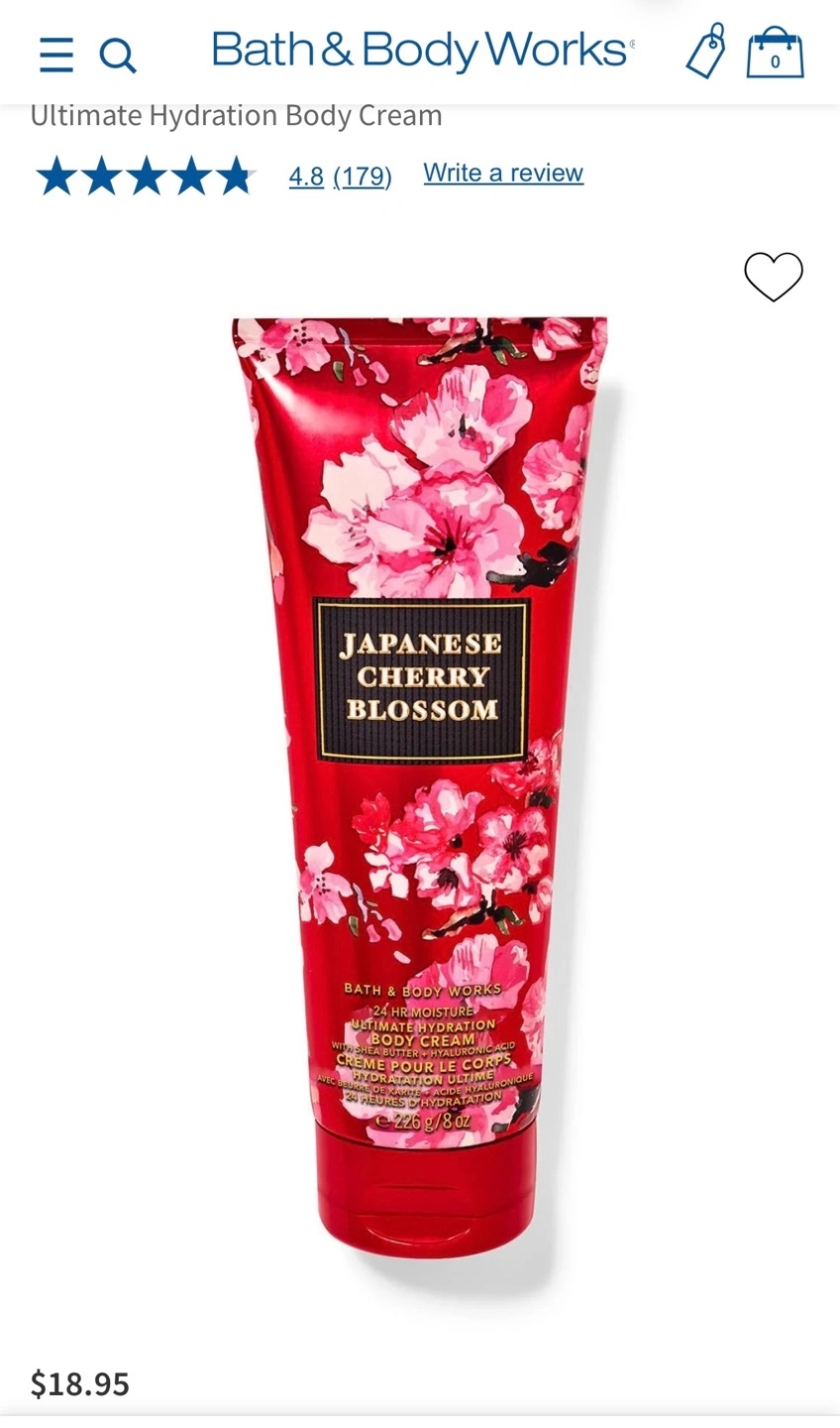 The beauty of the exotic gardens of Japan with a graceful, award-winning blend of pear, Japanese Cherry Blossom & sandalwood Ultimate Hydration Body Cream 226g Fine Fragrance Mist 236ml $30.00 set