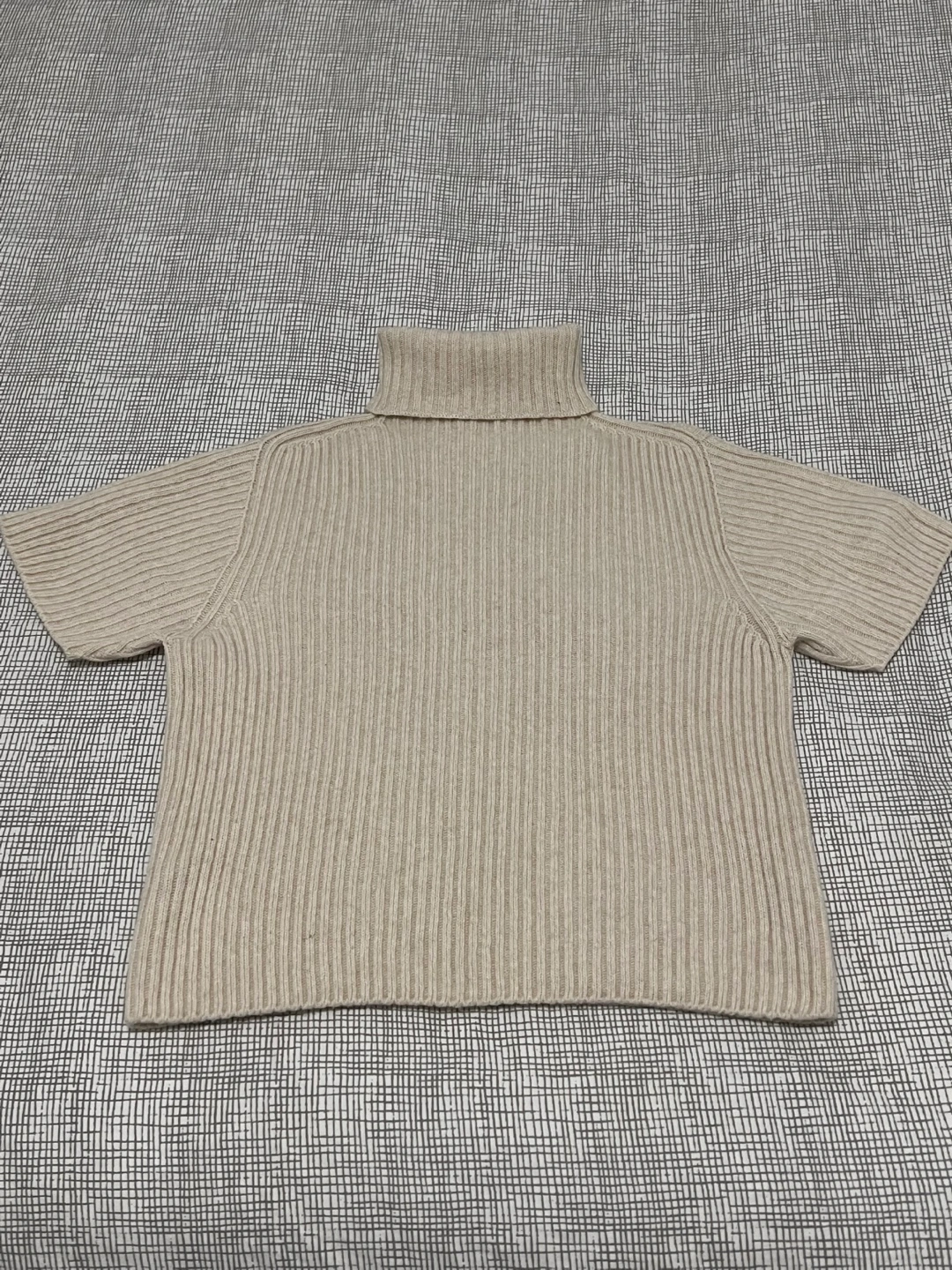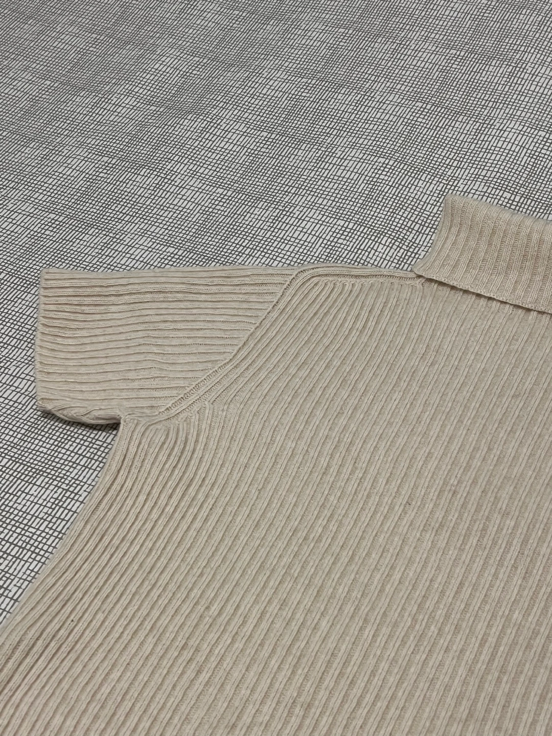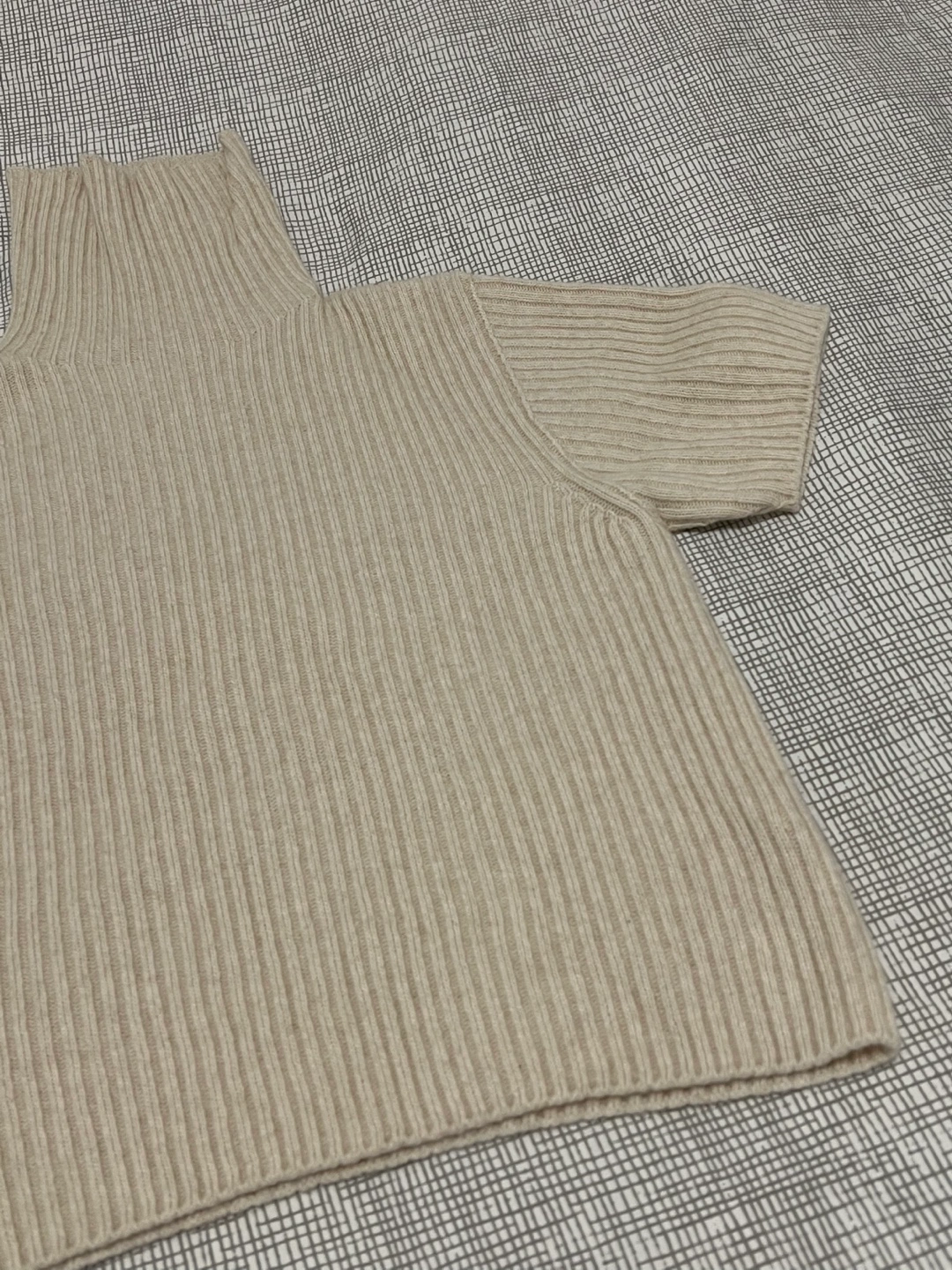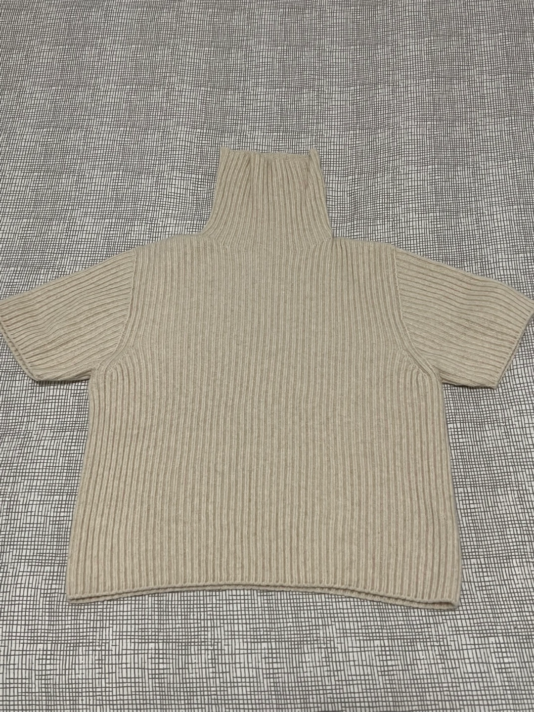 Short-sleeved, ribbed knit top. Mock turtleneck. Cream colour. Lightweight material. Whole garment - no stitches.