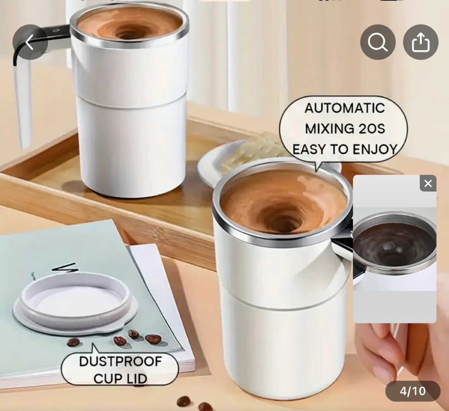 Automatic mixing mug. Easy to use. Includes dustproof lid. Great for coffee, tea, or hot chocolate.