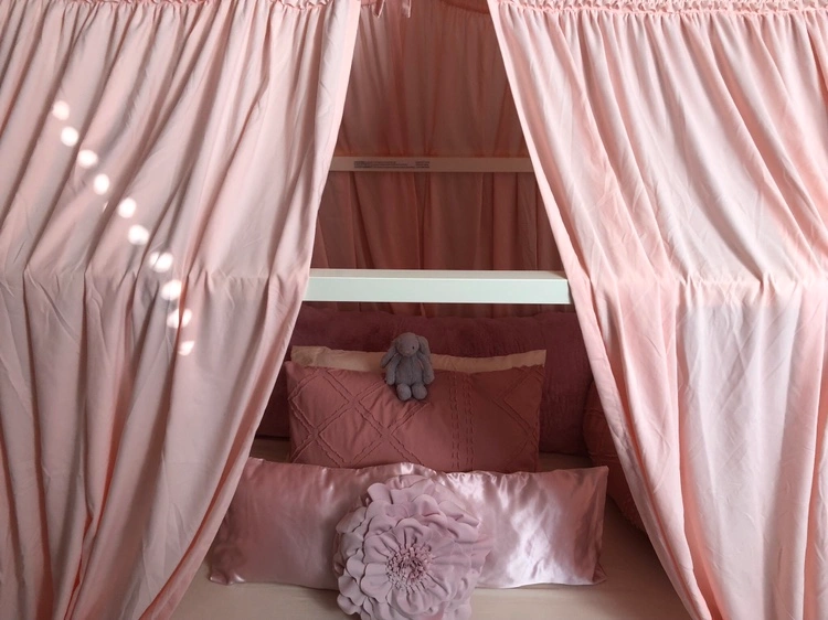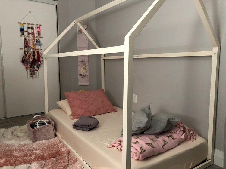 Adorable house-shaped bed frame with a pink canopy. Perfect for a child's room. Includes frame and curtains. Some assembly required. Happy to deliver and assemble for $50 if within London.