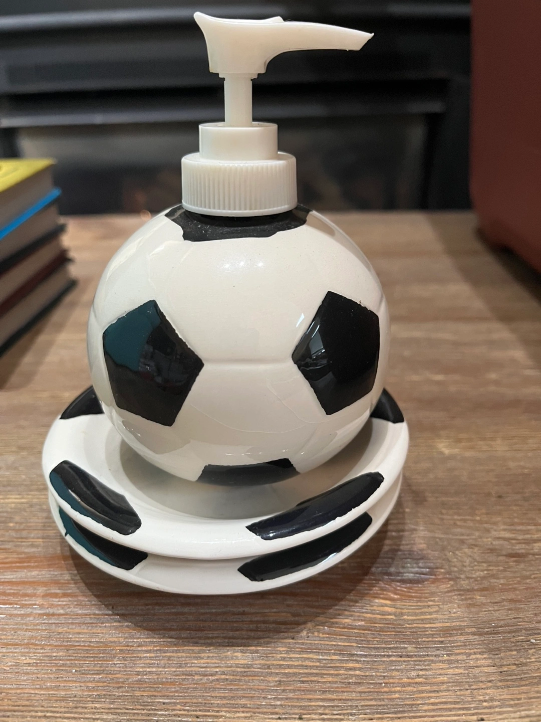 Cute soccer ball-themed soap dispenser. Features a pump and matching tray. Perfect for a sports fan's bathroom.