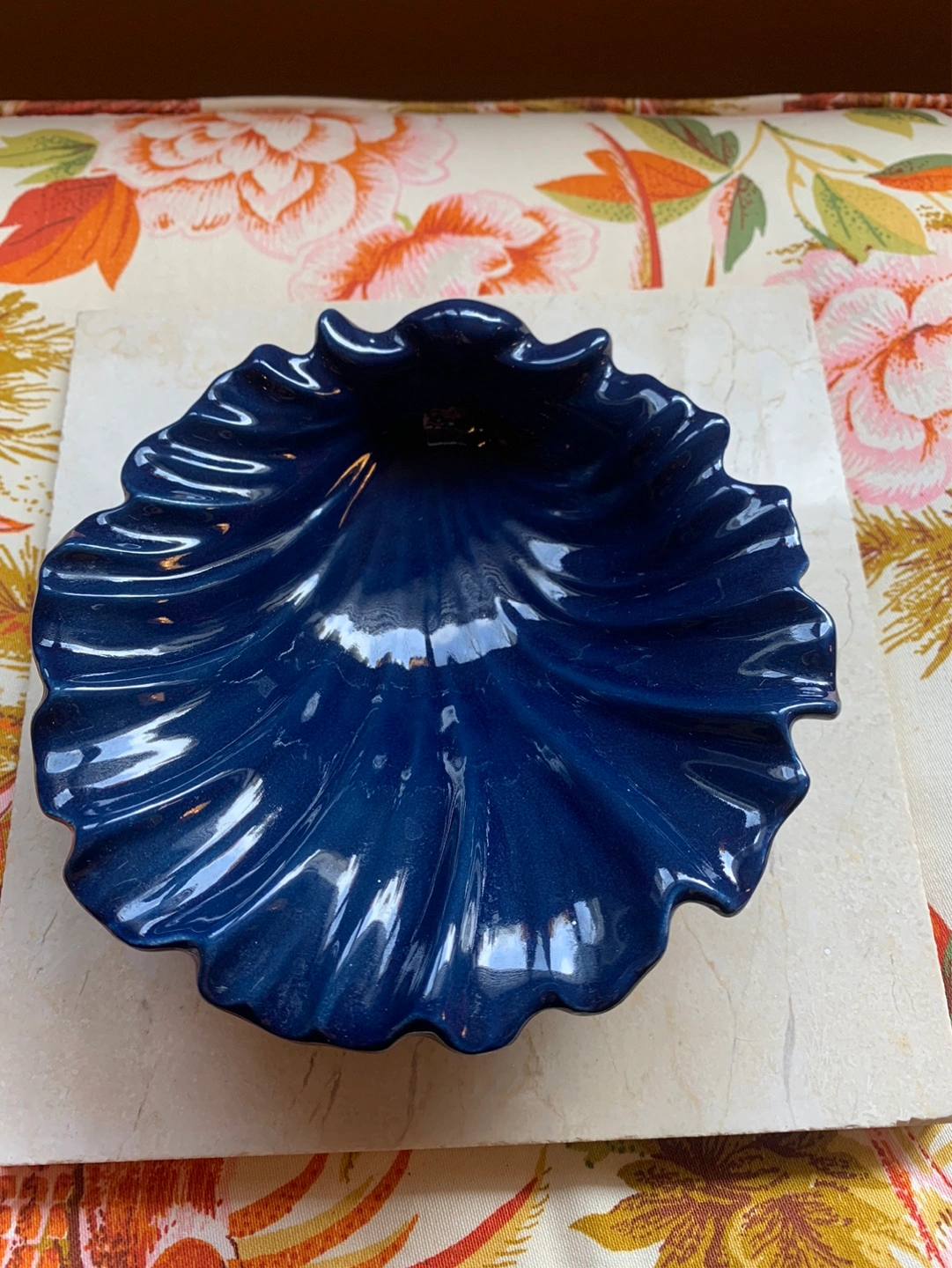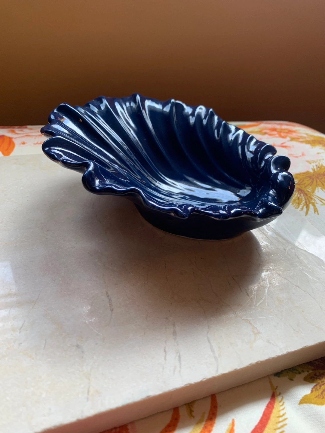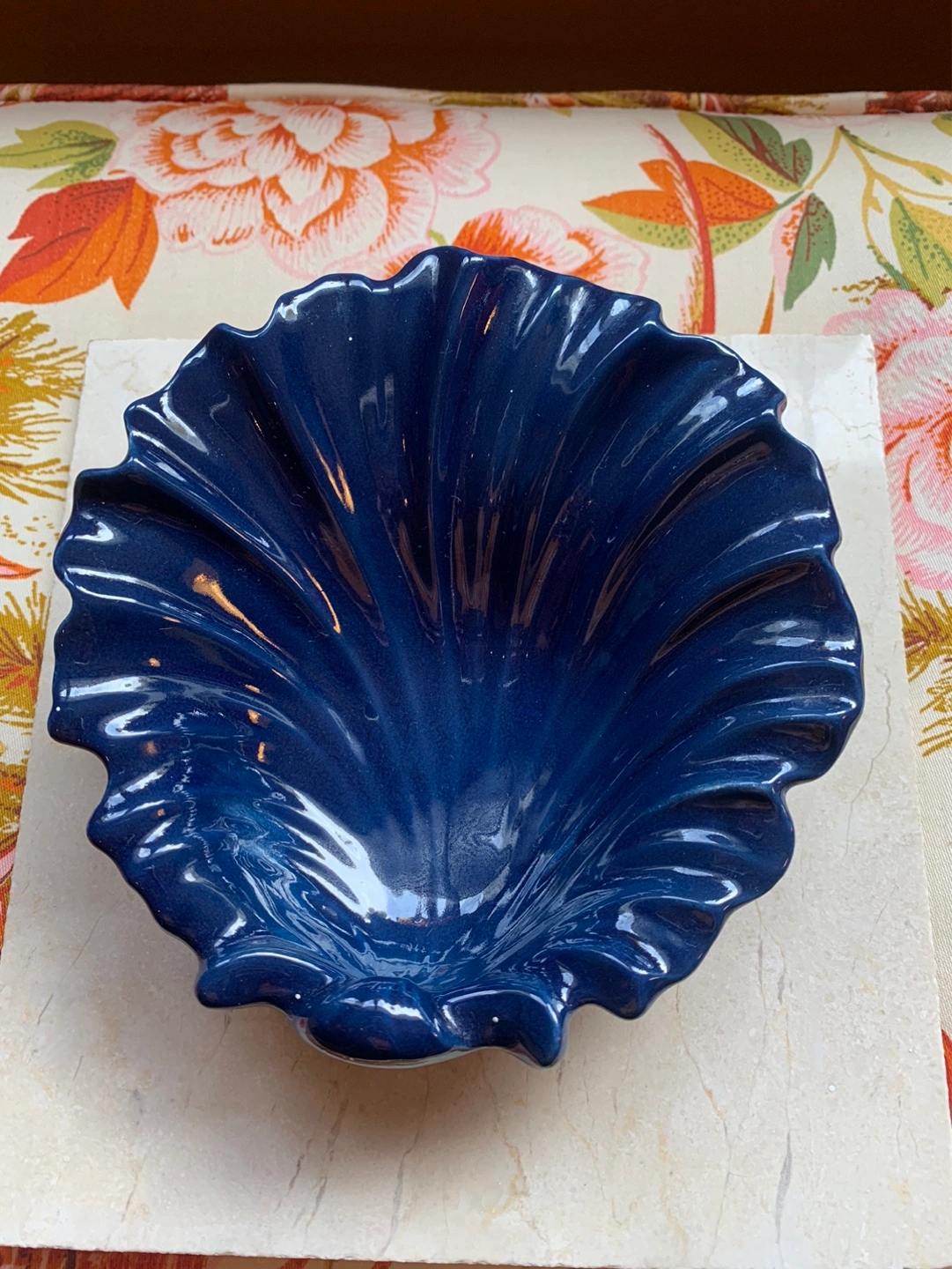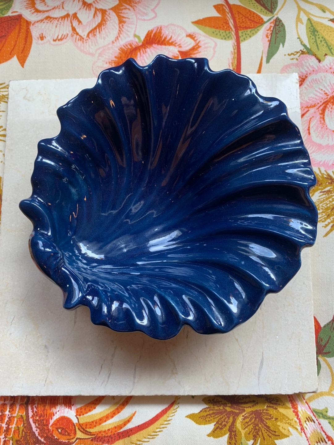 Gorgeous cobalt blue sea shell pottery dish. 💙 A small decorative dish/bowl that could become a trinket dish, soap dish in a kitchen/bathroom or just a beautiful piece of decor to display! The deep cobalt blue is perfection …there is one outer rim piece that looks like it got missed in the glazing process and maybe one other piece that is a tiny chip but it does not take away from the piece. As seen in the pics. Cash only please.