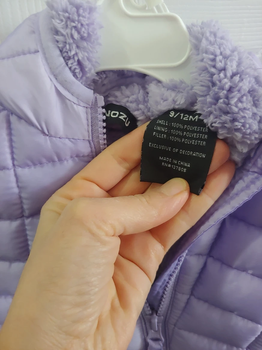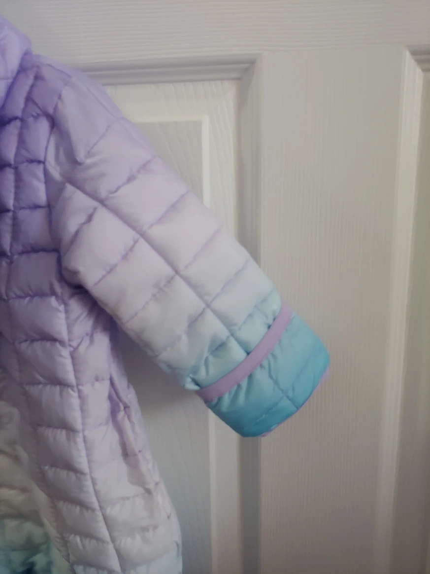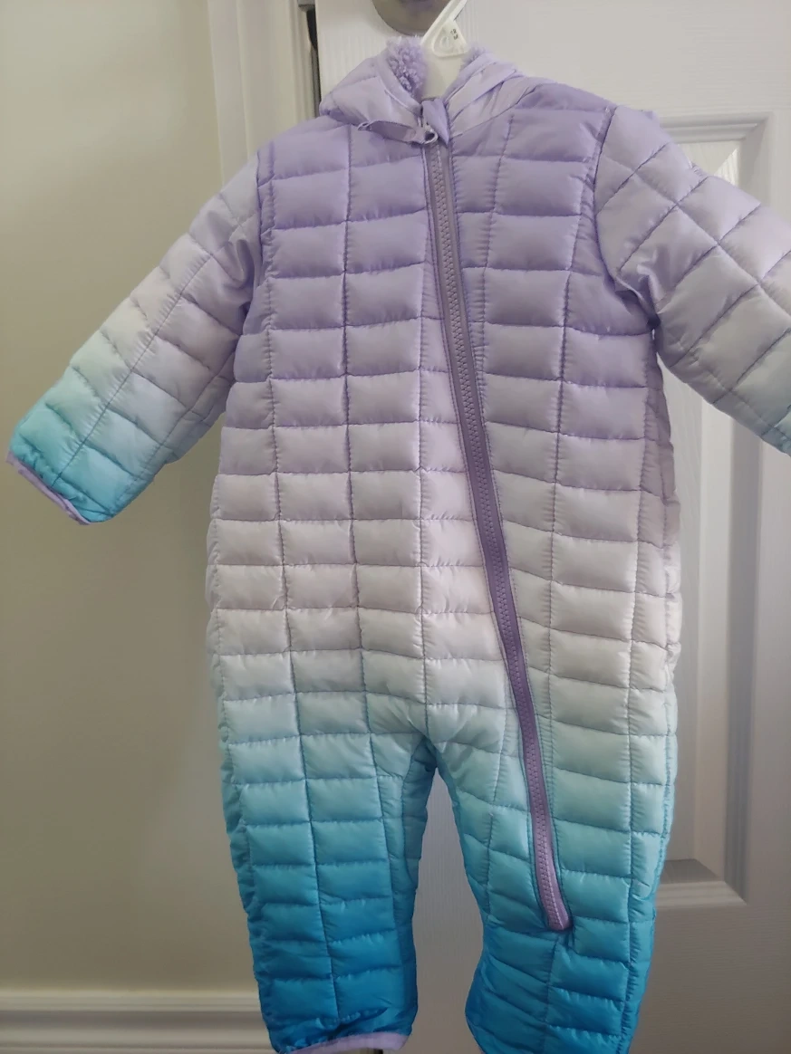 Adorable ombre purple and blue baby snowsuit. Size 9-12 months. Features a full zipper and sherpa lined hood. Lightweight and warm.