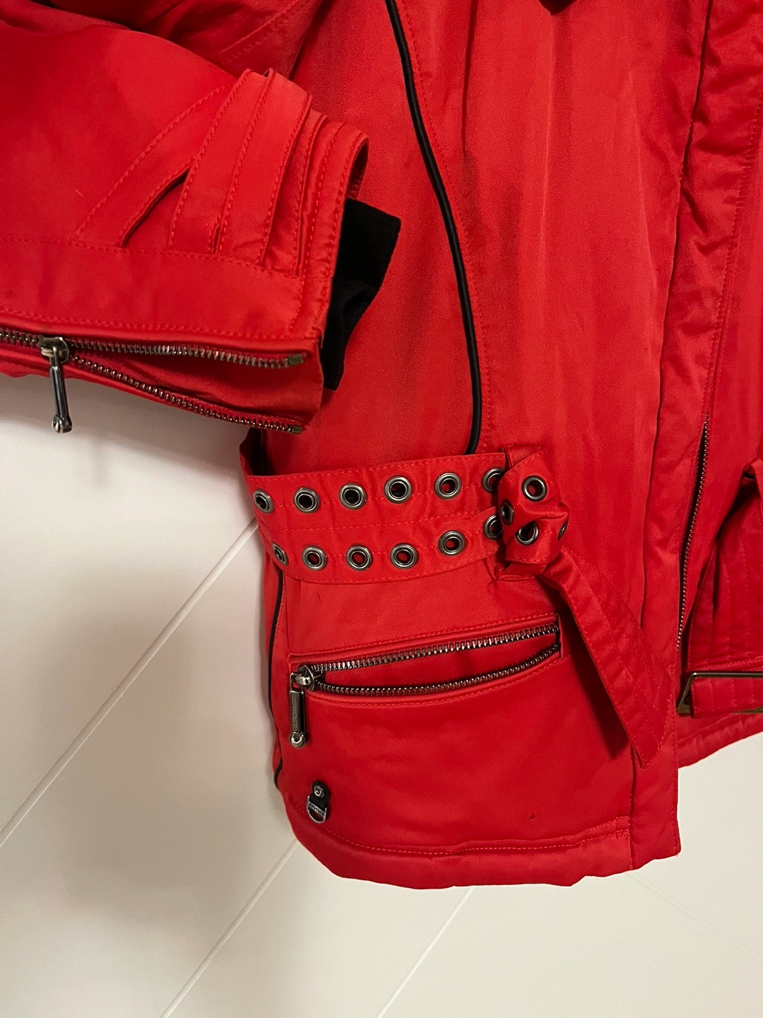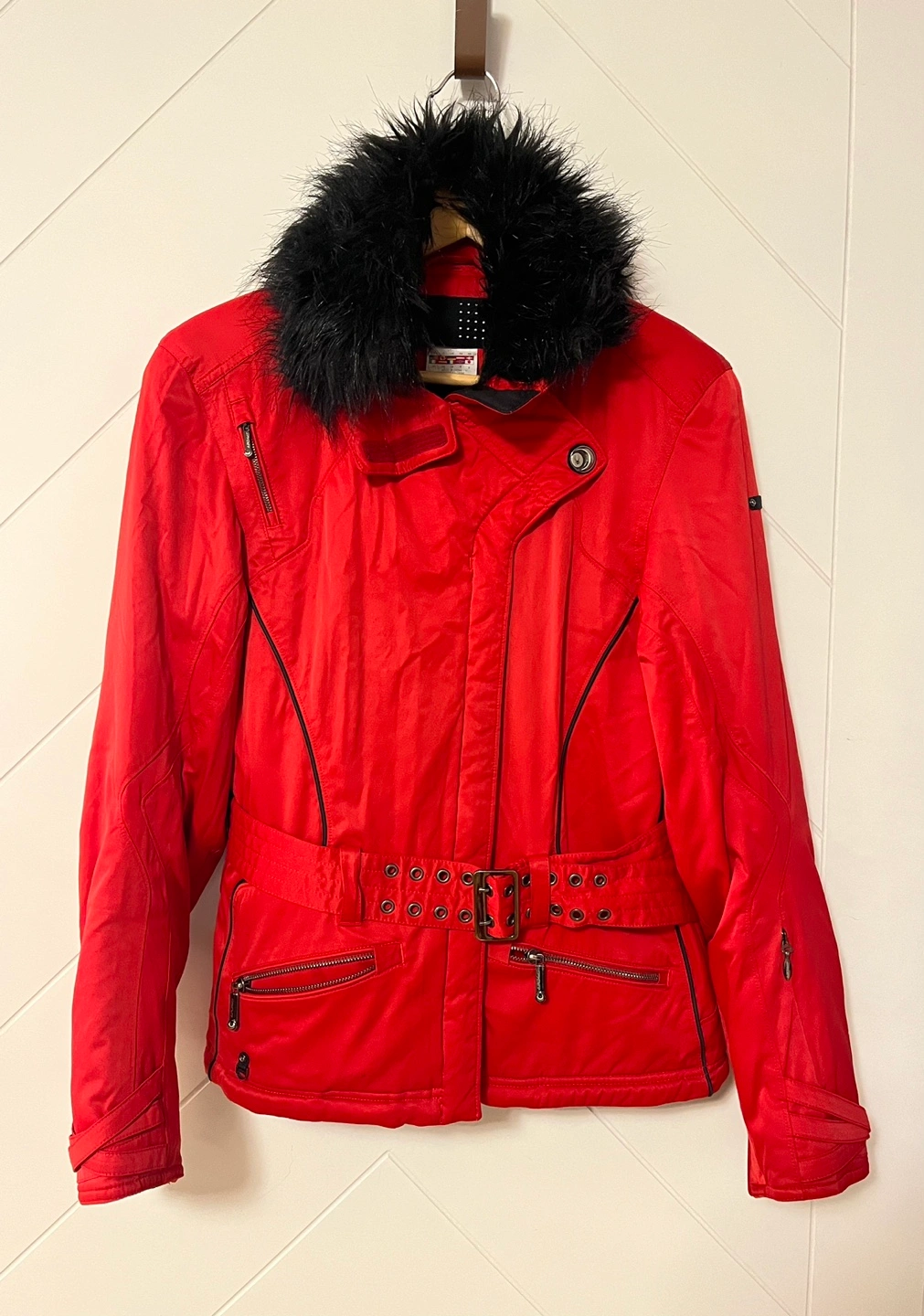 Women's red ski jacket with removable faux fur collar, belted waist, and multiple pockets. Water resistant Great for skiing or snowboarding Size M Pick up Bloor and Islington Etobicoke