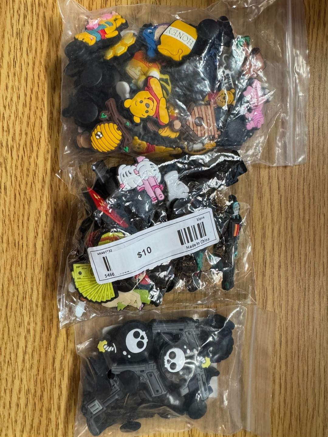 Three bags of shoe charms. One bag features Winnie the Pooh characters. Another bag includes various designs. The third bag contains skull and gun charms. Each bag is $10