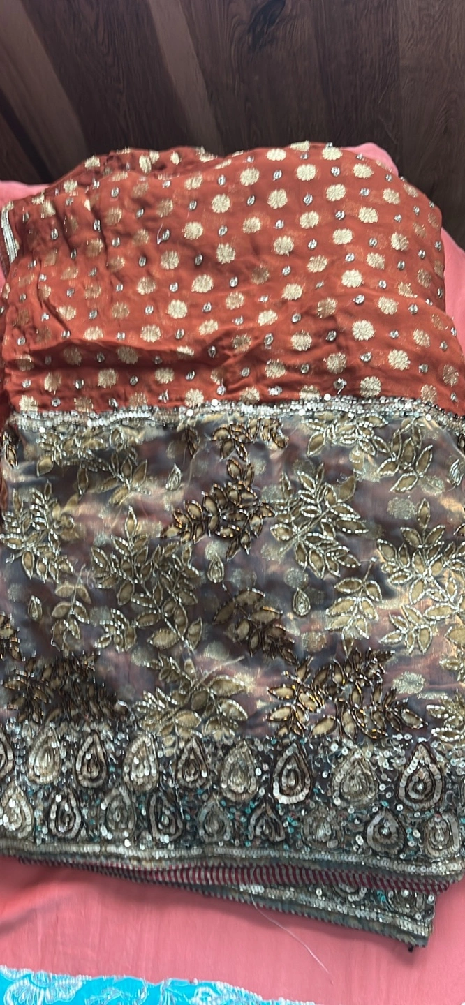 Beautiful saree, two-toned. Features intricate embroidery and sequin details. Stunning colours and textures. Ready to wear.