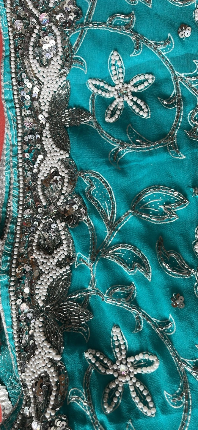 Beautiful teal saree. Intricate beading and sequins. Floral pattern. Stunning detail. Stitched saree with stitched blouse