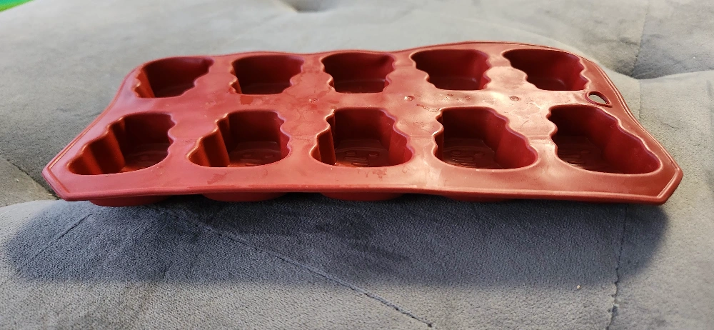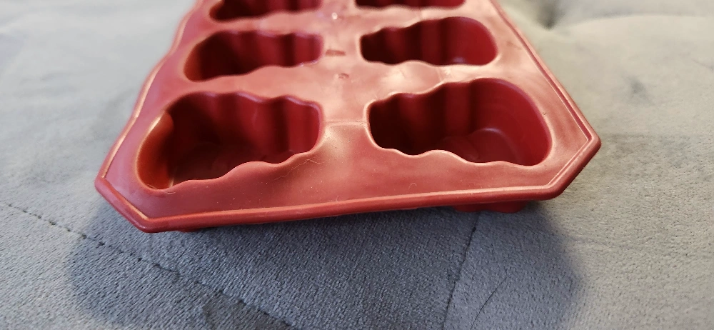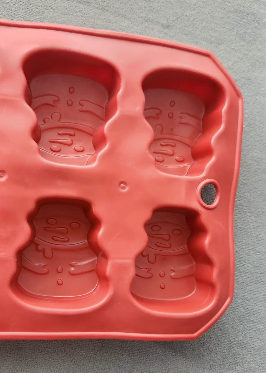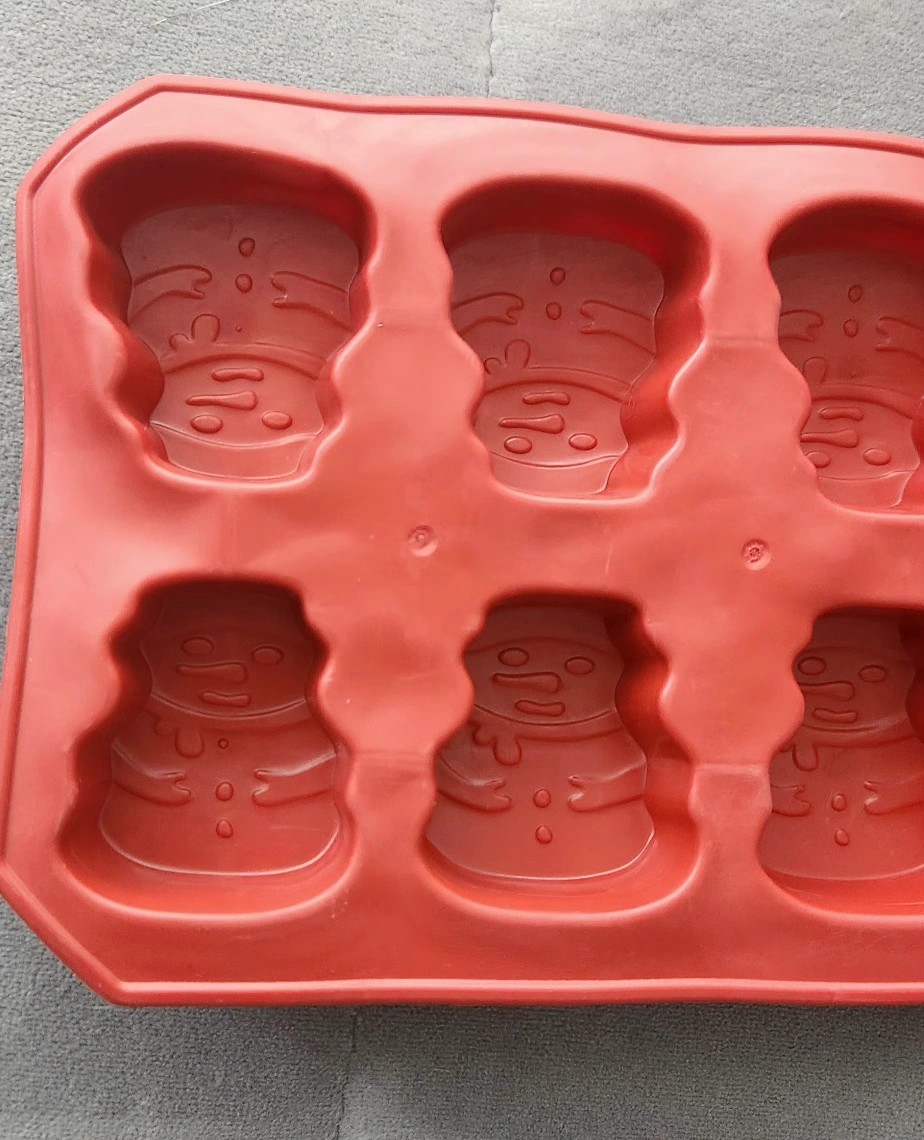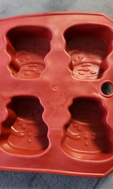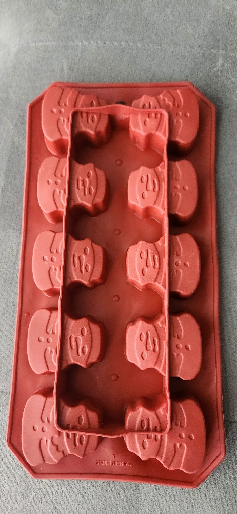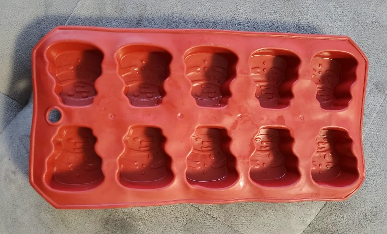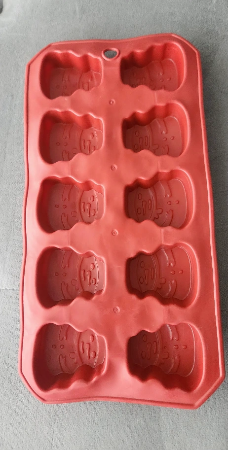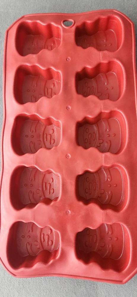 Red silicone mould. Twelve snowman cavities. Great for making chocolates, candies or ice. Like new condition.