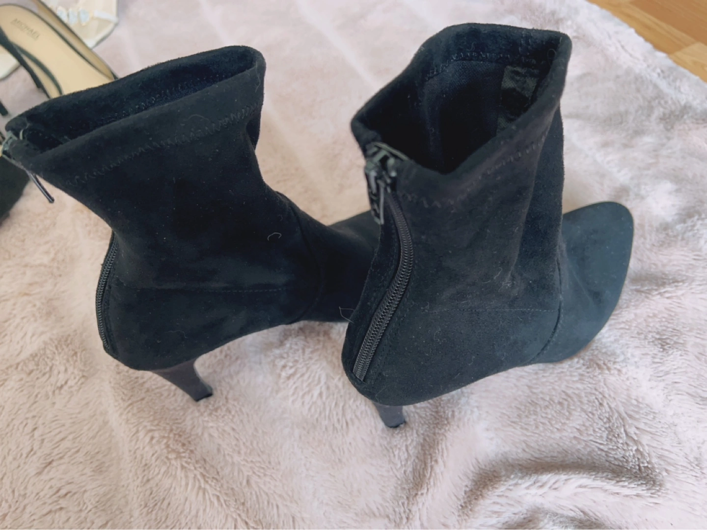Pair of black suede ankle boots. Pointed toe and stiletto heel. Side zipper closure. Size 6 bought from winners