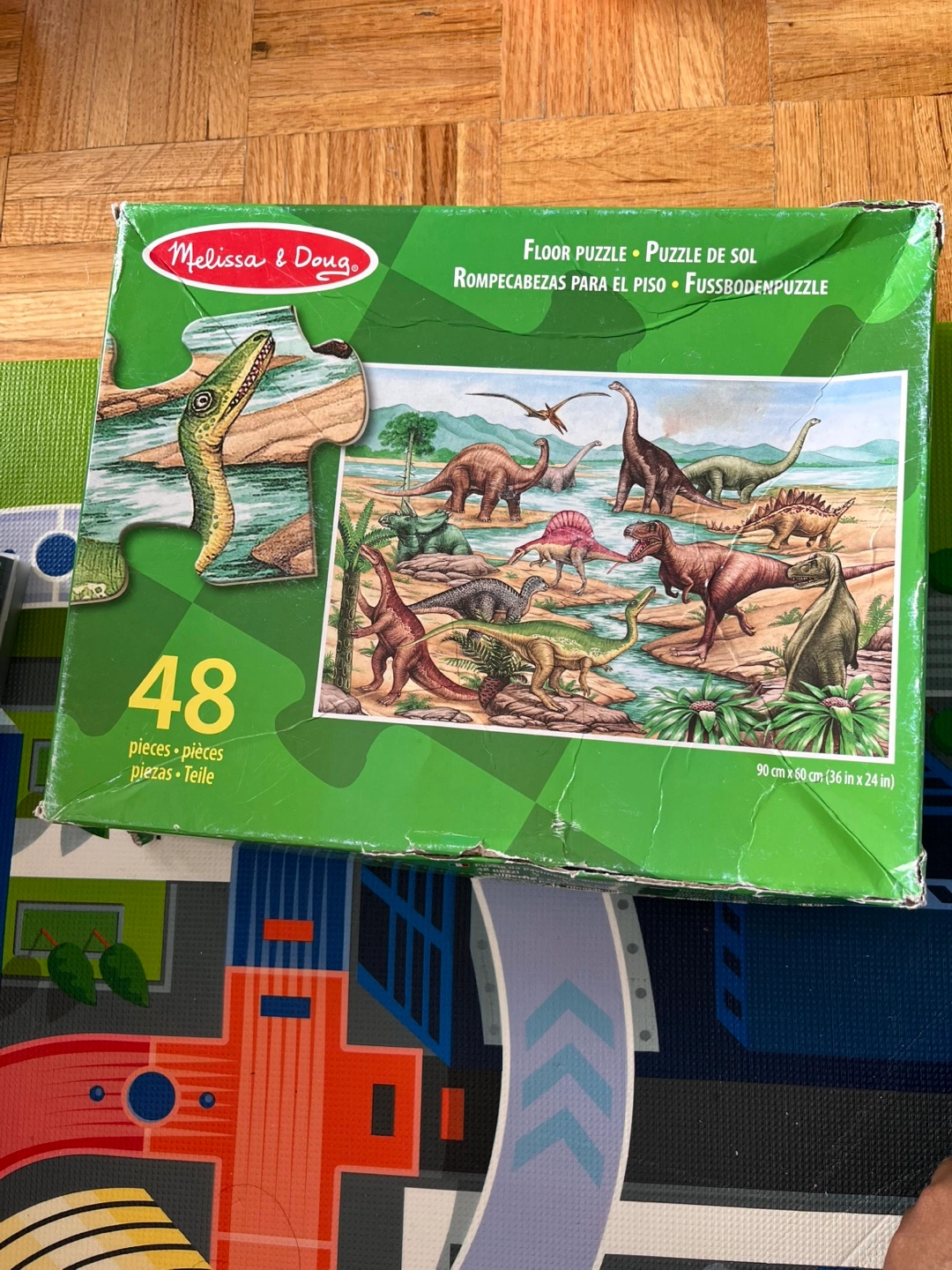 48-piece dinosaur floor puzzle. Measures 90cm x 60cm (36in x 24in). Features various dinosaurs in a landscape setting.