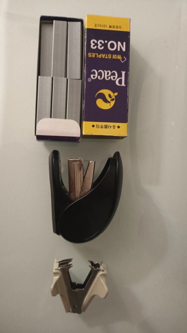 Used Peace brand stapler, box of No.33 staples, and staple remover. All items show some wear.