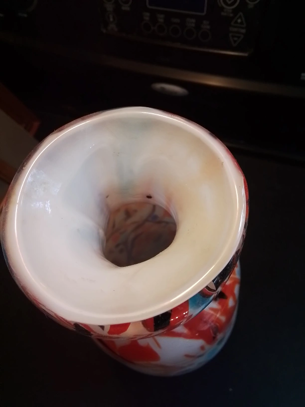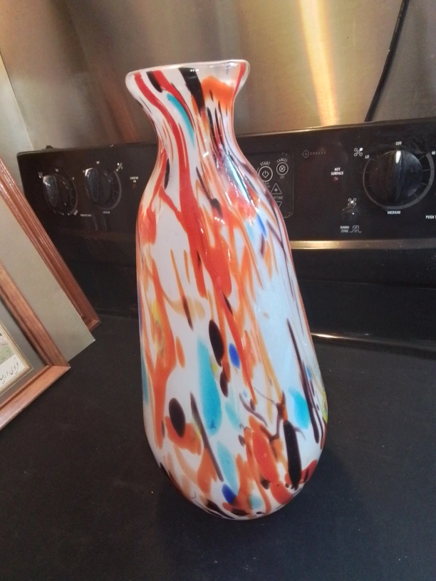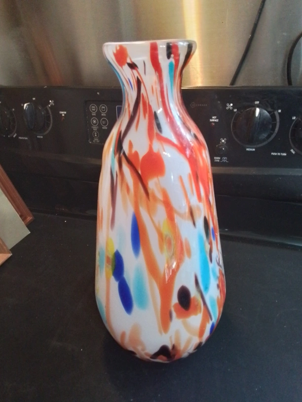 Unique glass vase. Features a white base with orange, blue, and brown accents. Shaped like a bottle. Approximately 13.75 inches tall. A tall Murano multicolor vase Brighten up any room with this colourful art glass vase, featuring a unique splash design that adds a touch of modern elegance. * Unique splash design * Adds a modern touch It's like this vase has a story to tell, and it's ready to be part of your home's narrative. If the ad is still up, you bet your bottom dollar it's available! Pickup at Young Street and Steels Ave