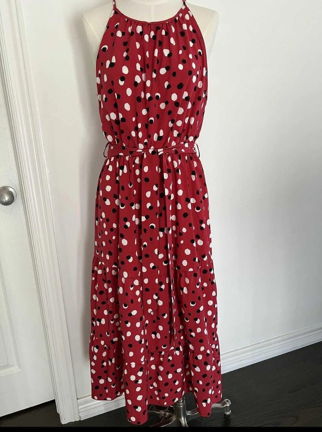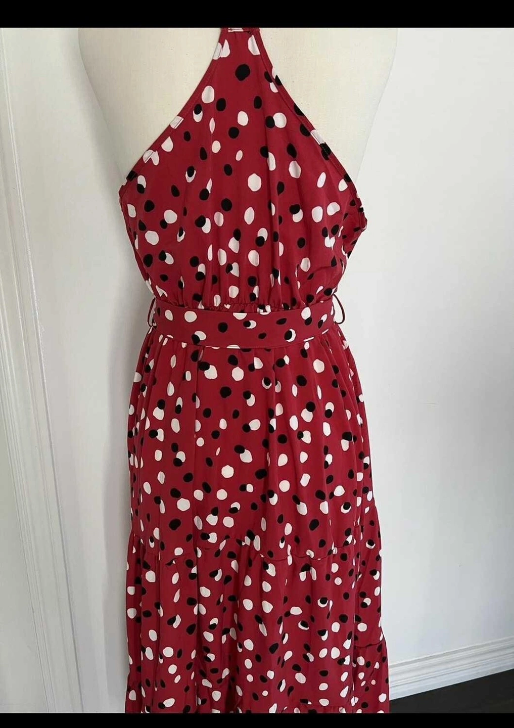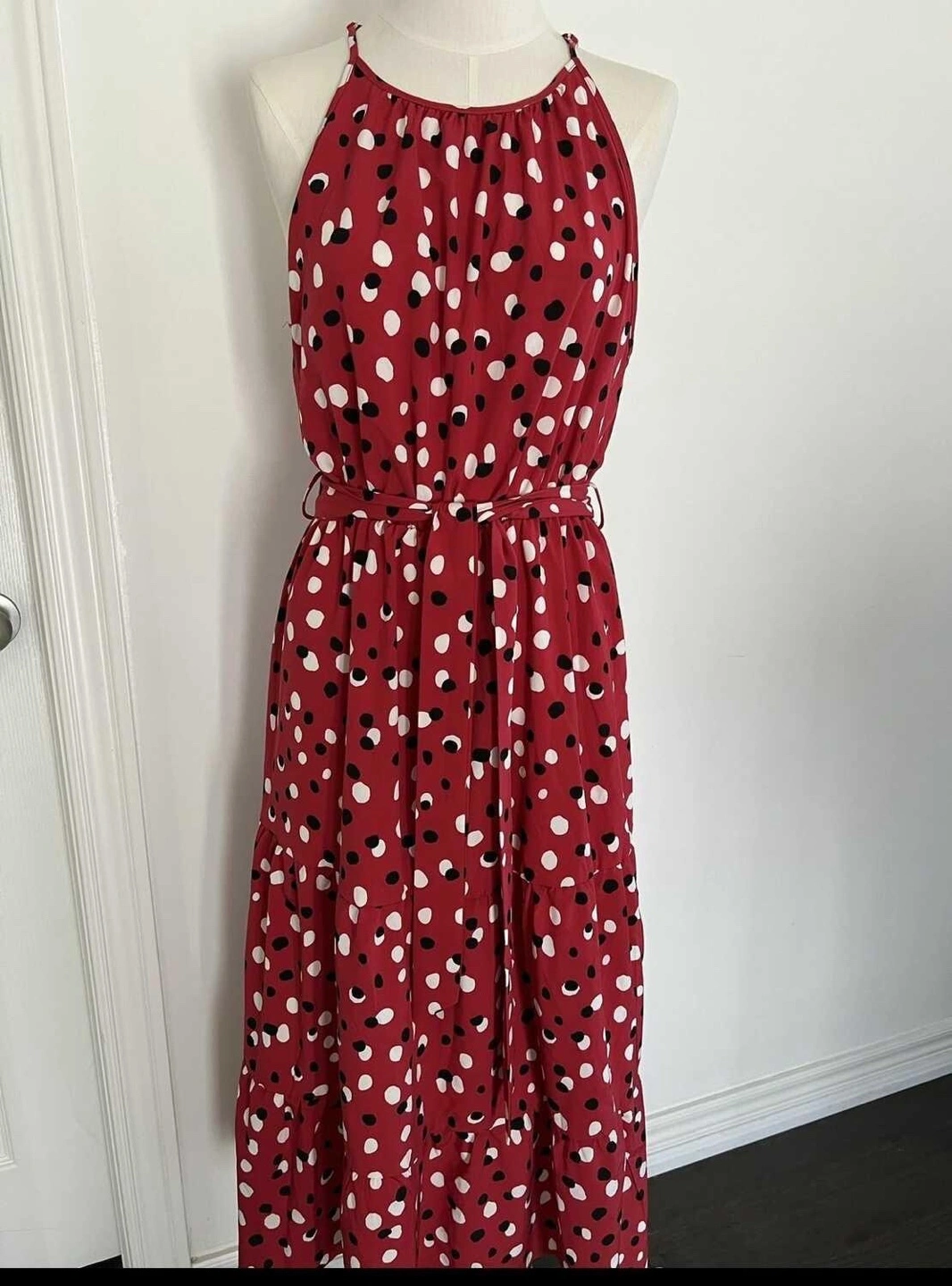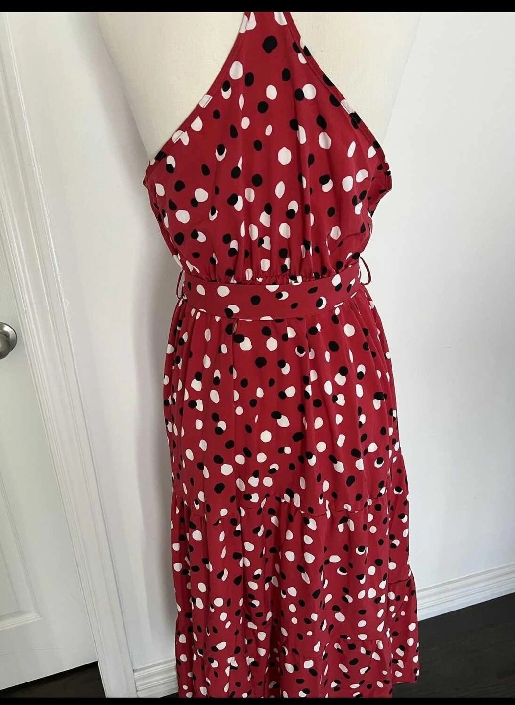 BNWT Brand new with tag. Beautiful red and white dress. Features a halter neckline and tiered skirt. Polka dot pattern in red, white and black. Includes a matching tie belt. Perfect for summer. Size large