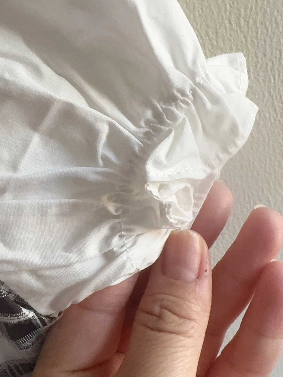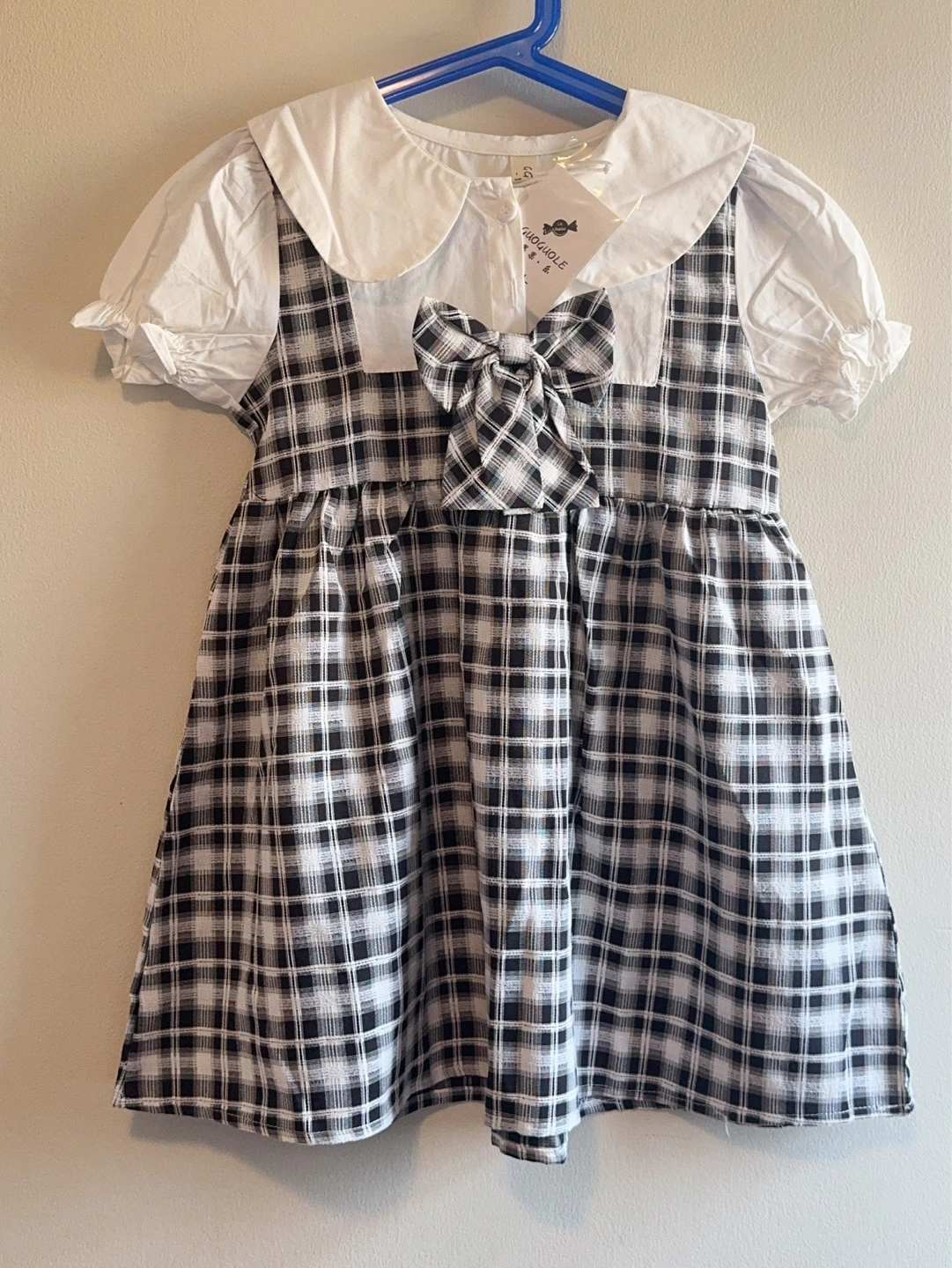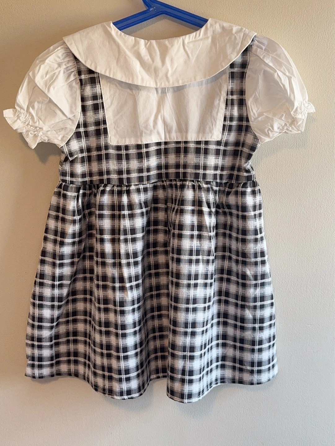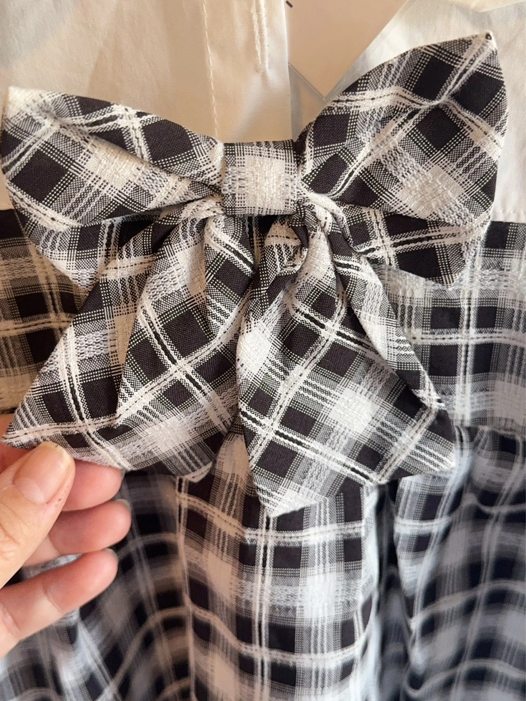 Features a black and white plaid pattern, and a matching bow. Short sleeves with ruffles. Tag still on.