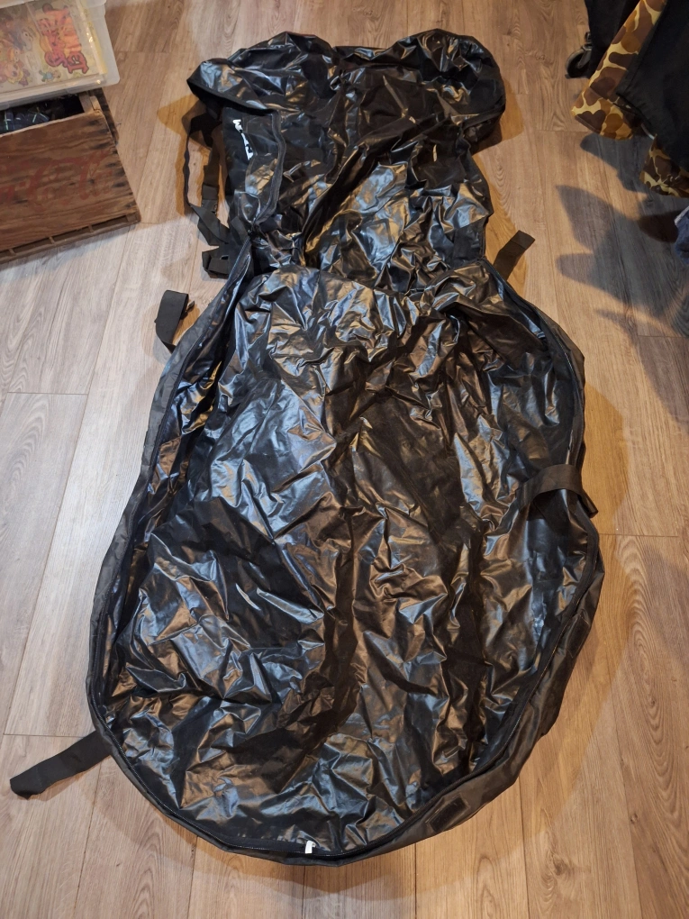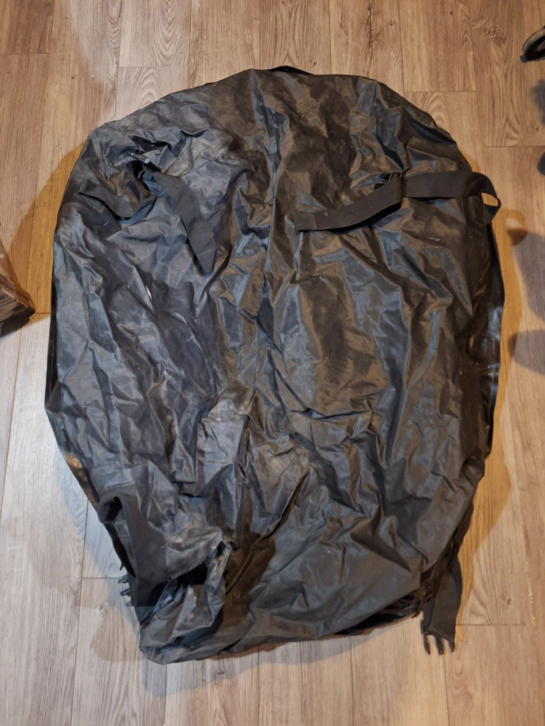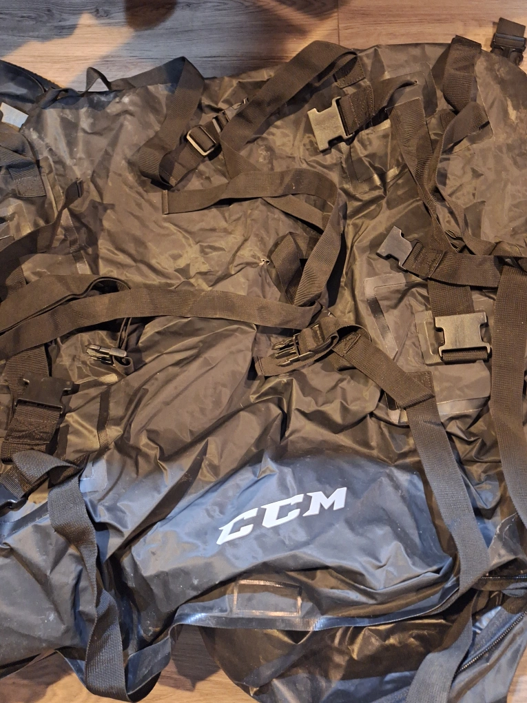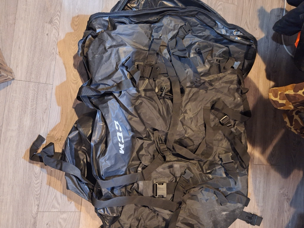 Large black hockey equipment bag. Multiple straps and buckles. Durable material. Shows some wear.