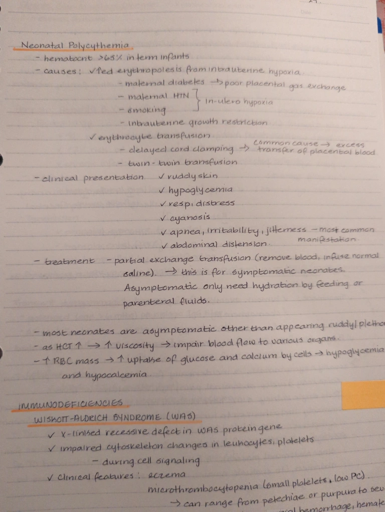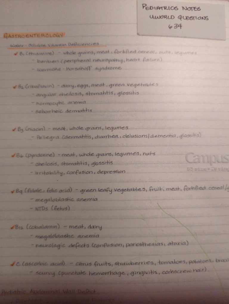 Handwritten notes covering pediatric topics, including neonatal polycythemia and immunodeficiencies. Gastroenterology section details vitamin deficiencies and their associated symptoms.