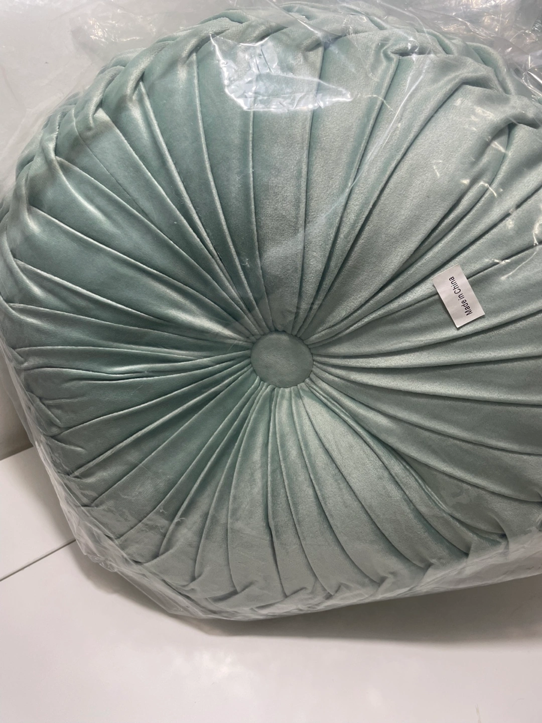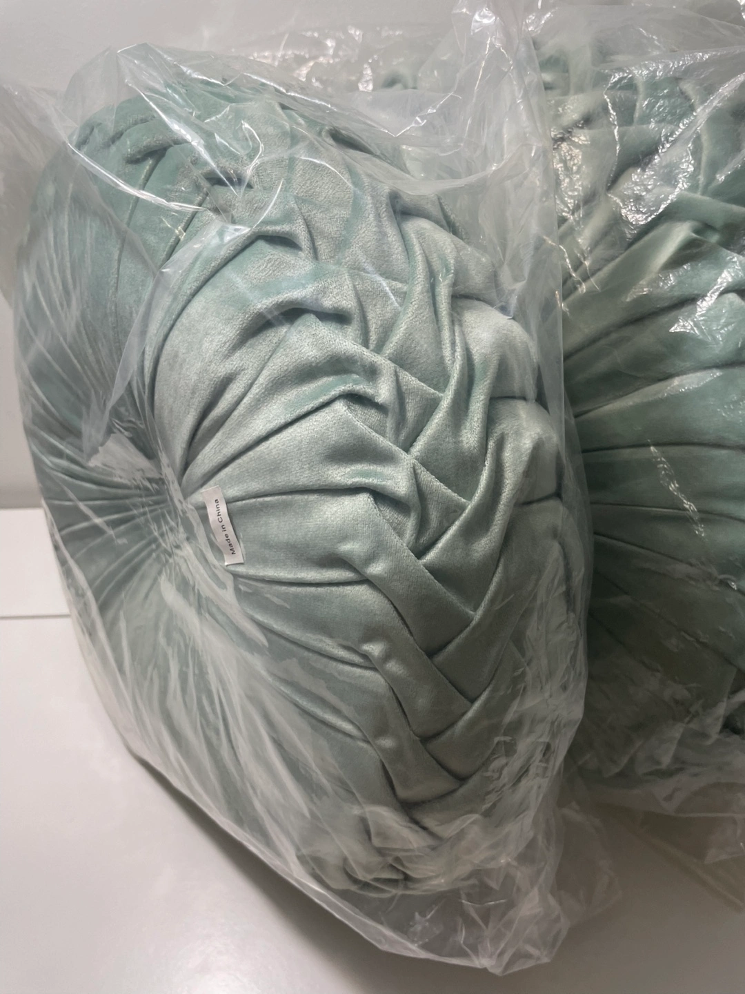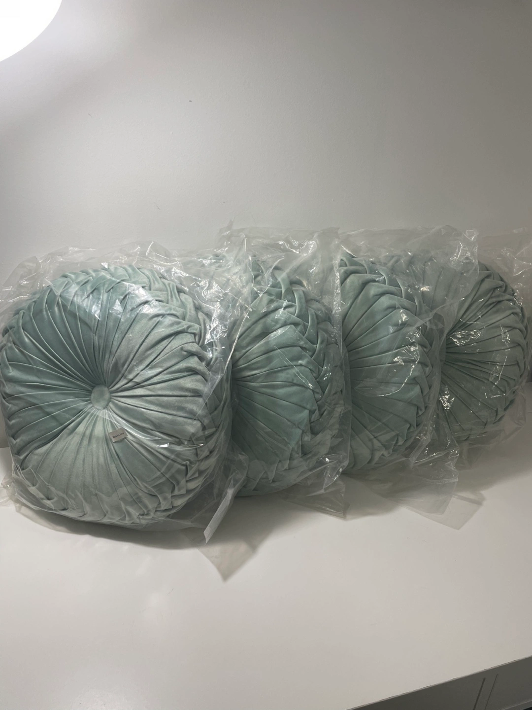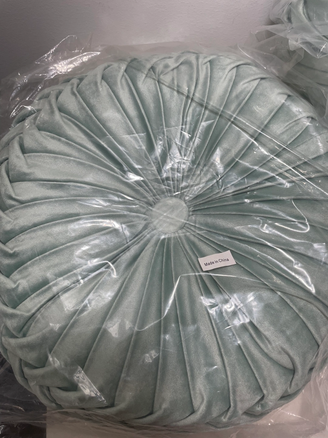 Four round pillows, sage green velvet. Plush texture. Individually packaged. Made in China.really good quality soft and comfortable