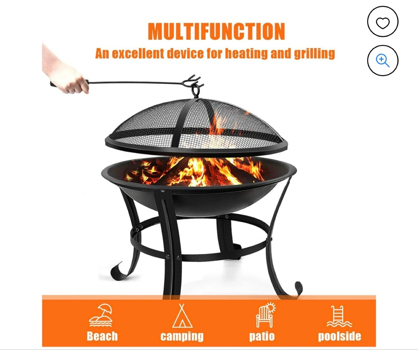 Black metal fire pit. Includes a mesh lid and poker. Perfect for patios, camping, beaches, or poolsides. Heats and grills.