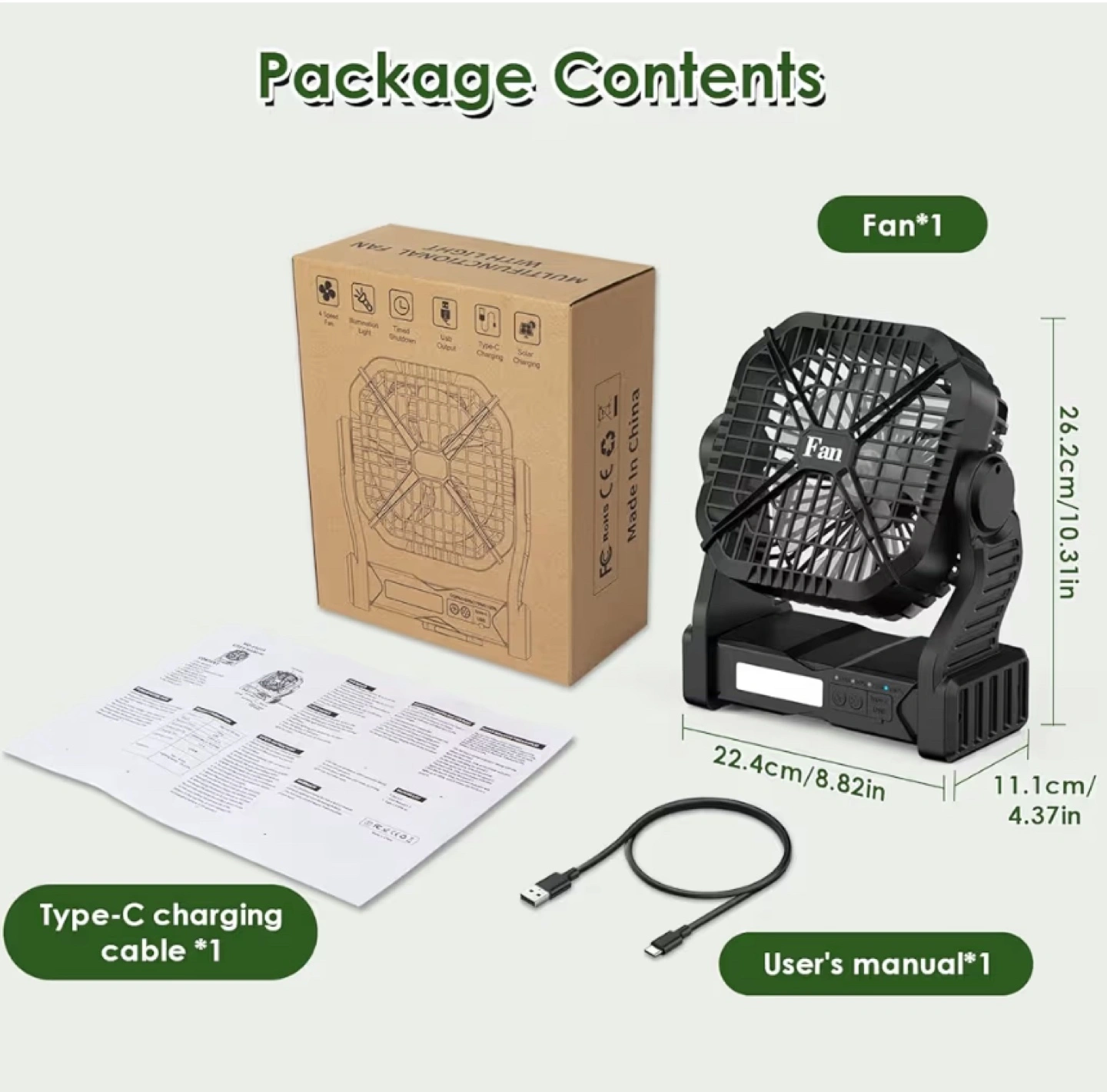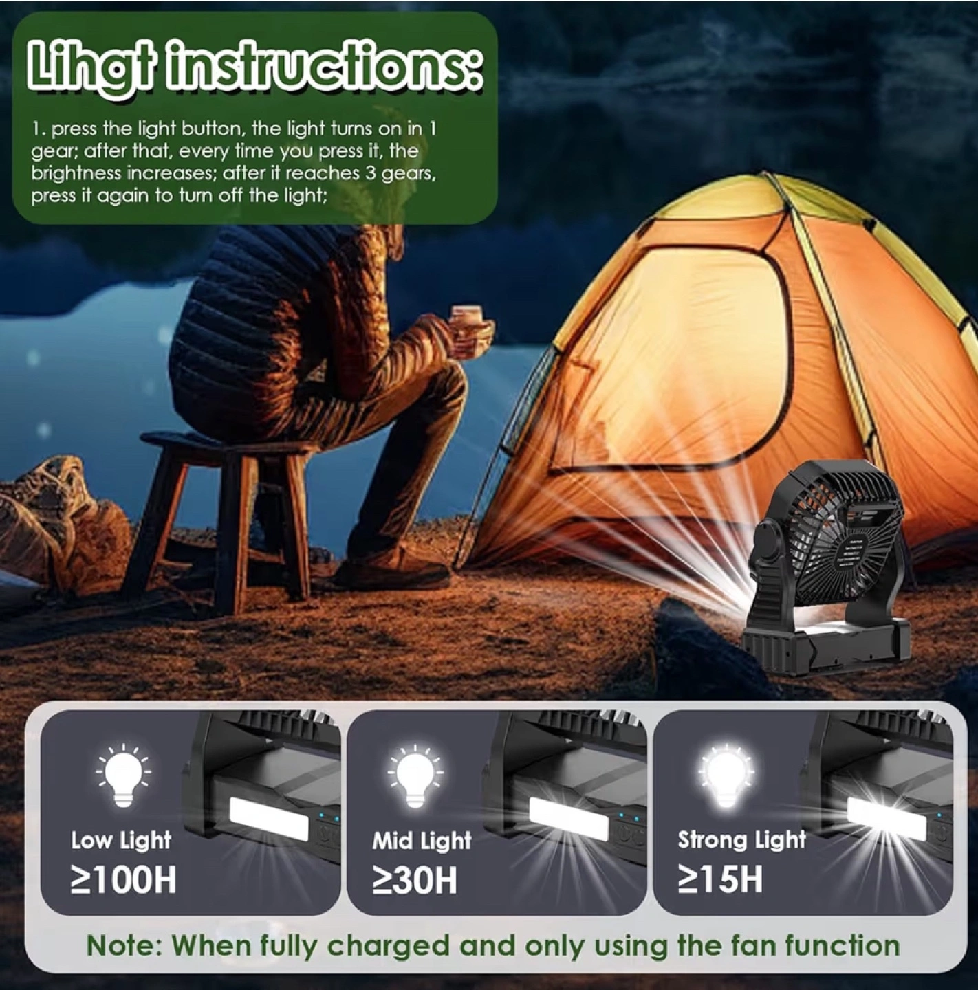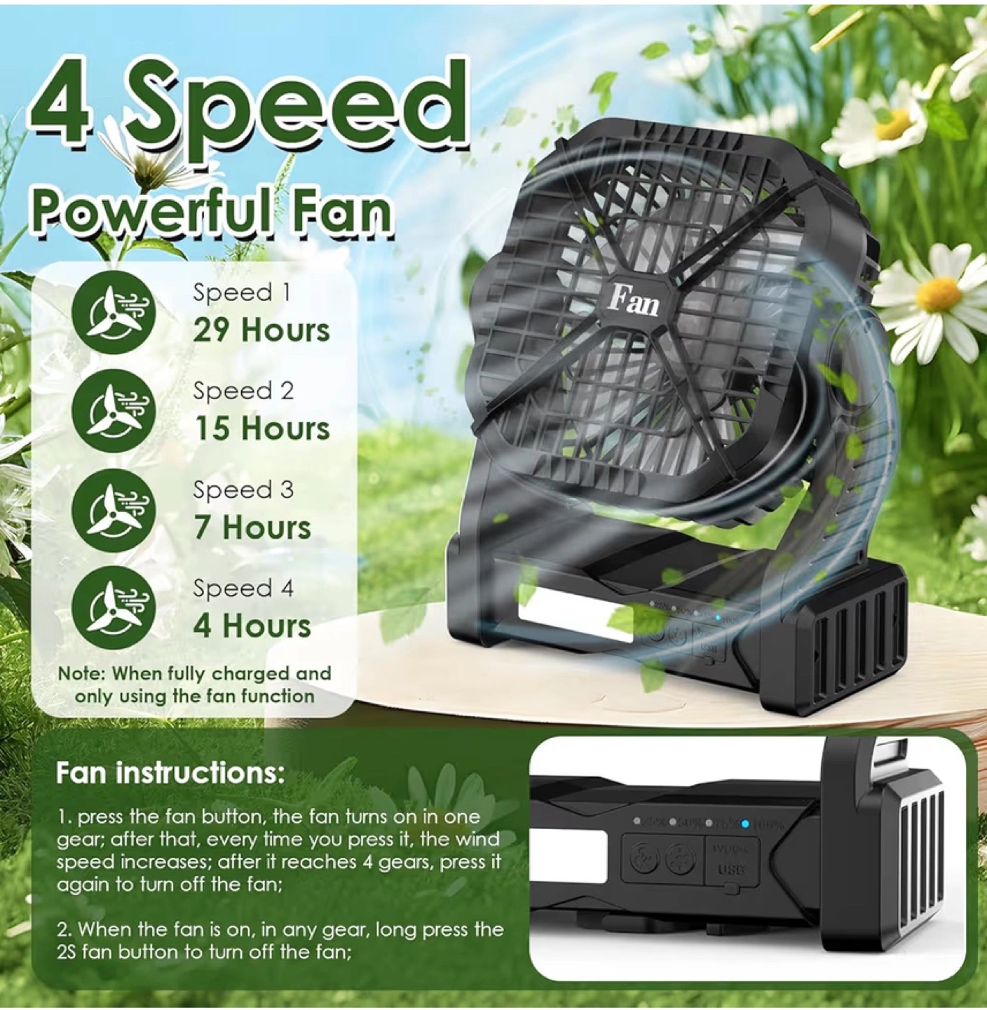 BRAND NEW! Powerful, 4-speed fan. Rechargeable battery. Includes LED light. Multiple uses: camping, fishing, RV travel, home and office. Type-C charging cable included. User manual included.