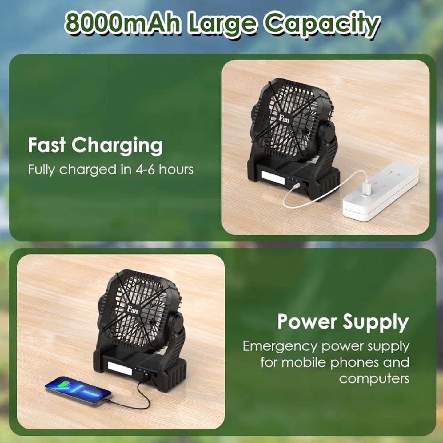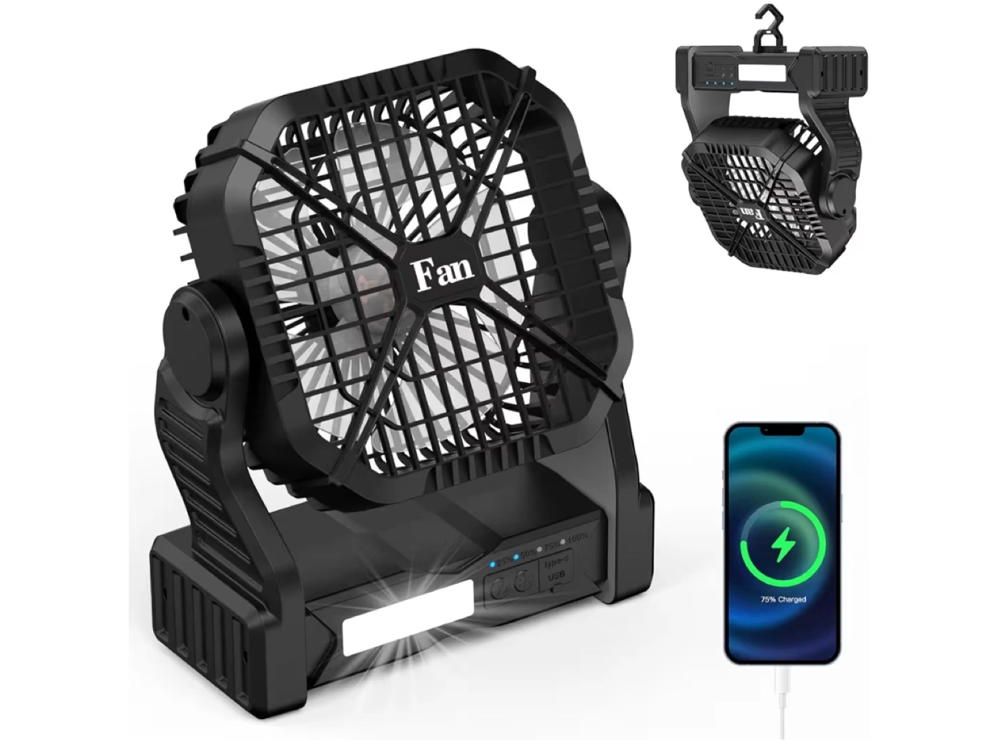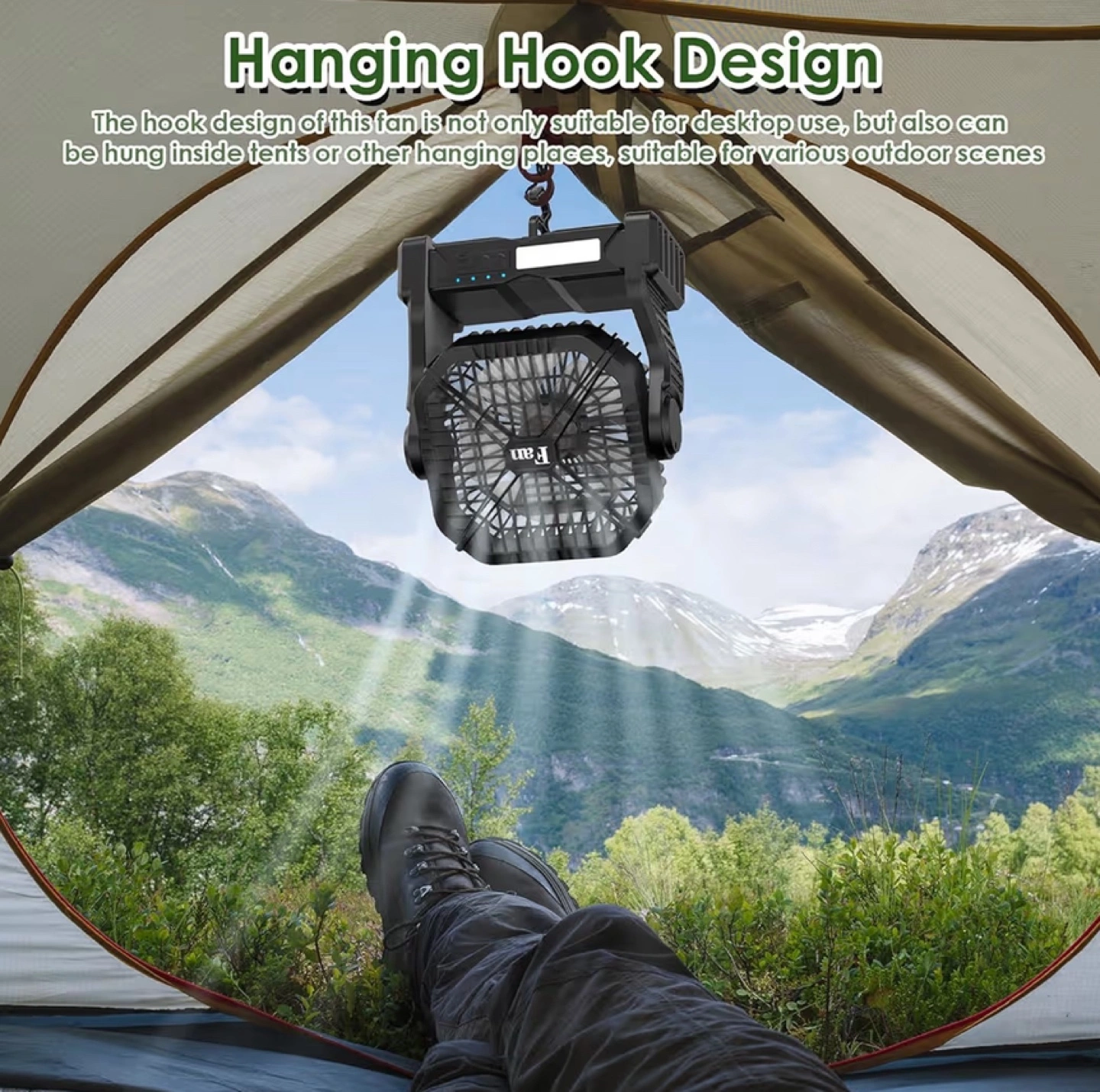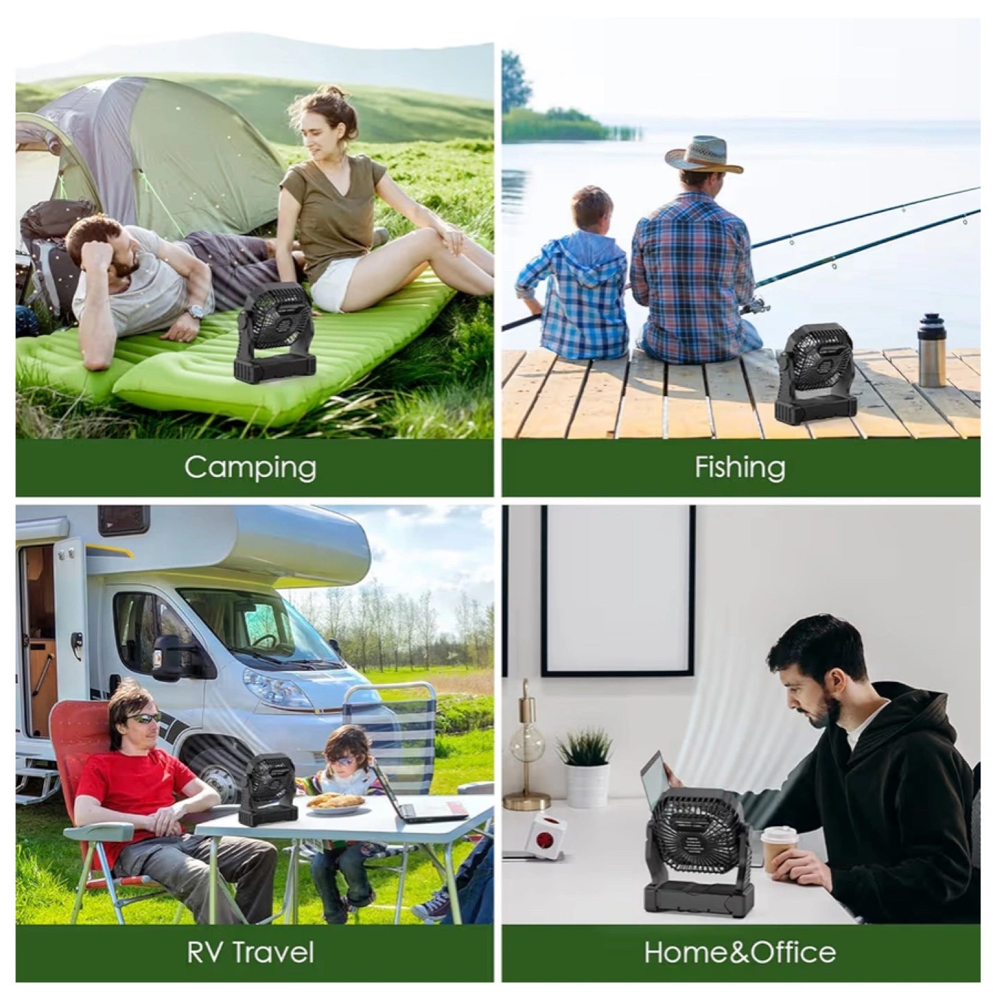 BRAND NEW! Powerful, 4-speed fan. Rechargeable battery. Includes LED light. Multiple uses: camping, fishing, RV travel, home and office. Type-C charging cable included. User manual included.