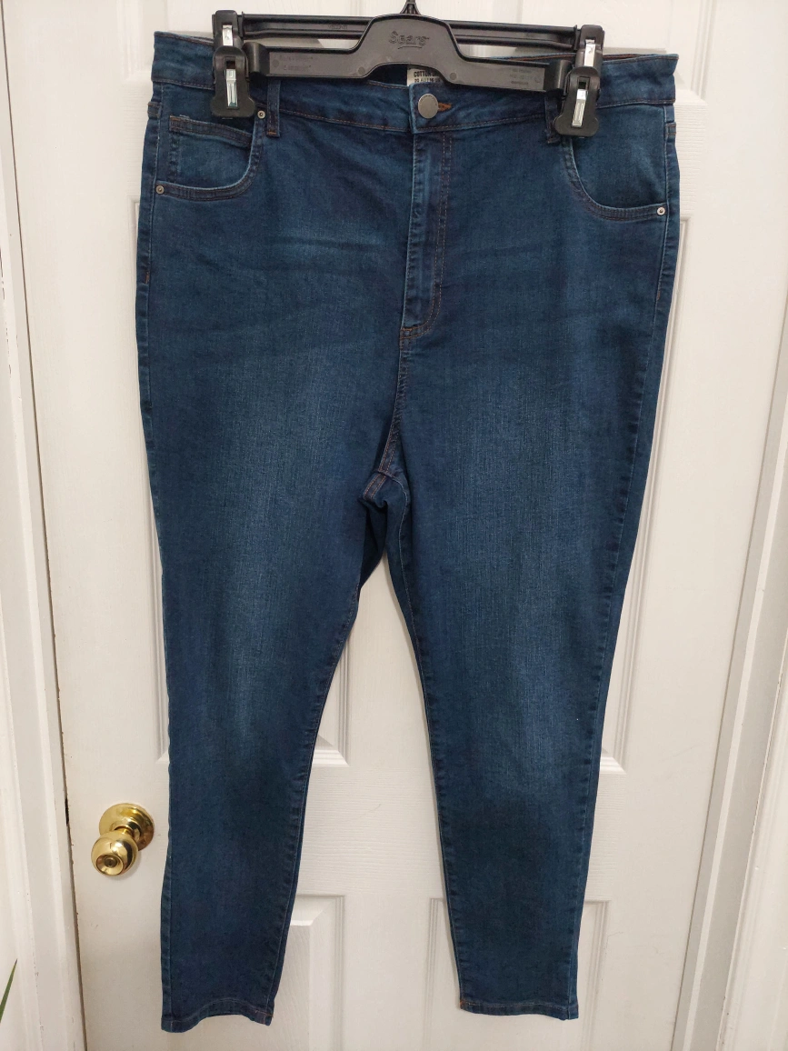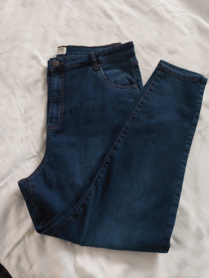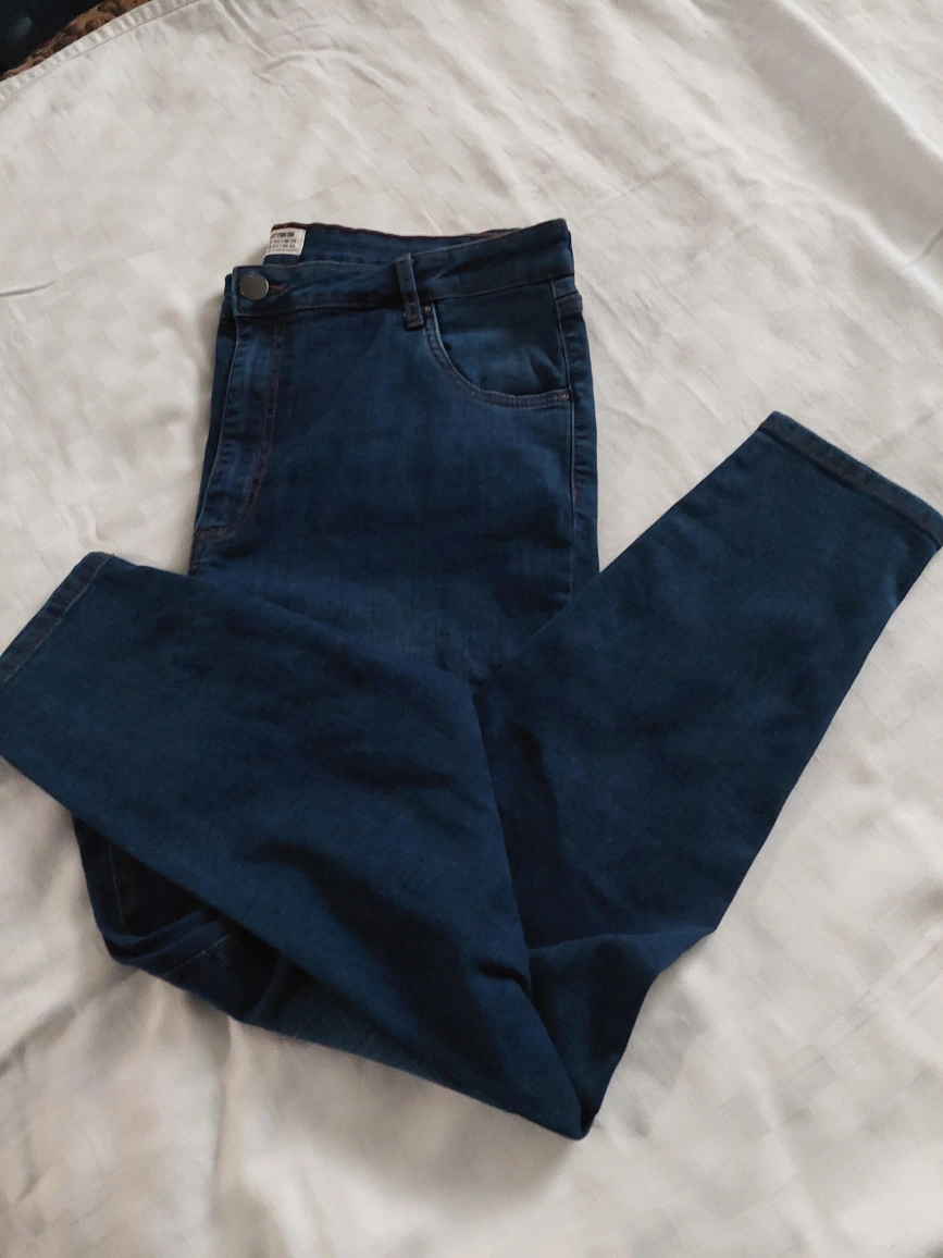 Deep blue coloured jeans. High-waisted skinny fit. Size 16. Inseam measured 28 inches. Please browse at my other pieces for a discount on multiple orders. Thank you for your time.
