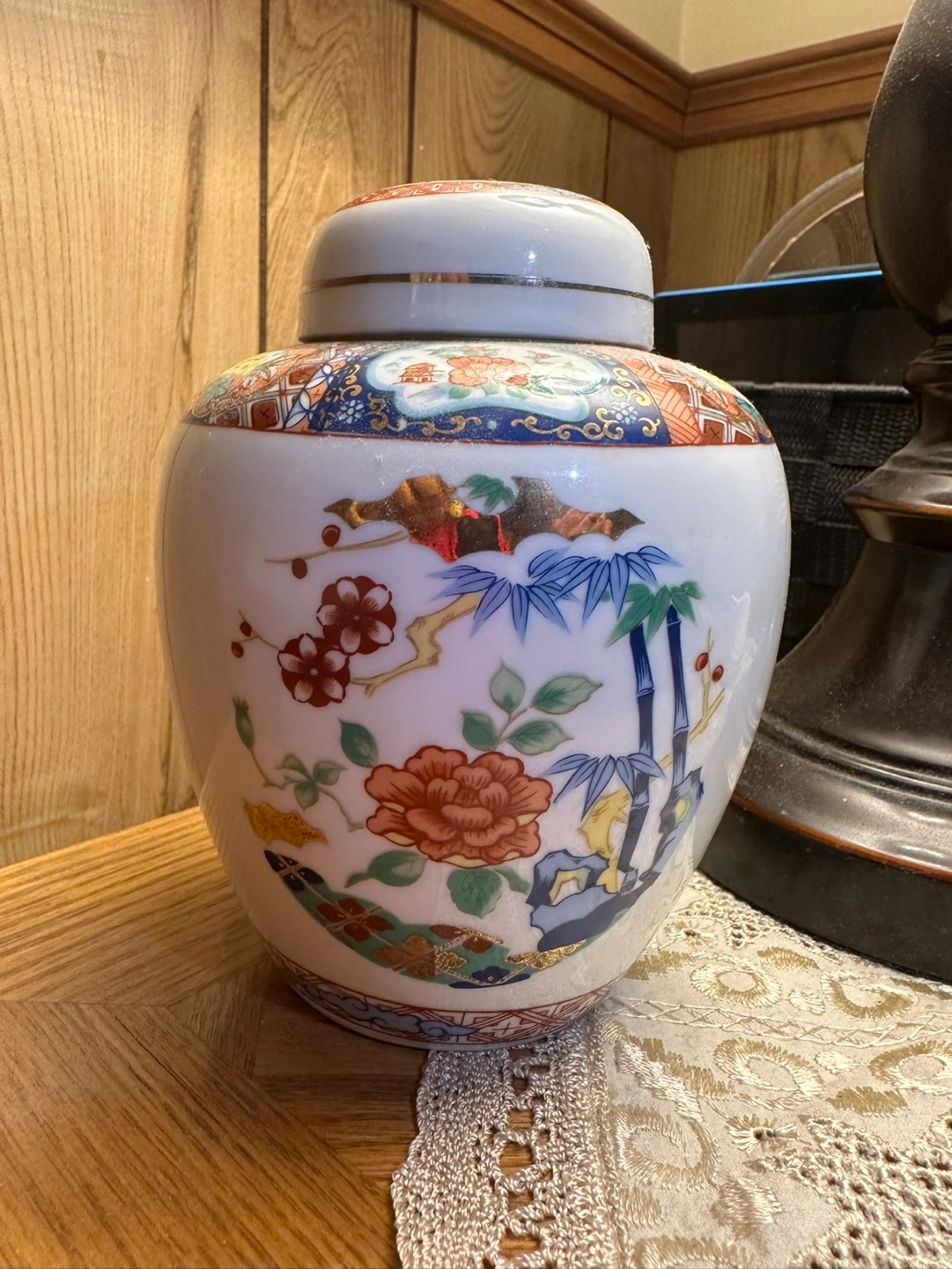Beautiful vintage jar. Features colourful floral and bamboo design. Lid included. Made in Japan.