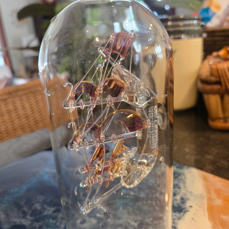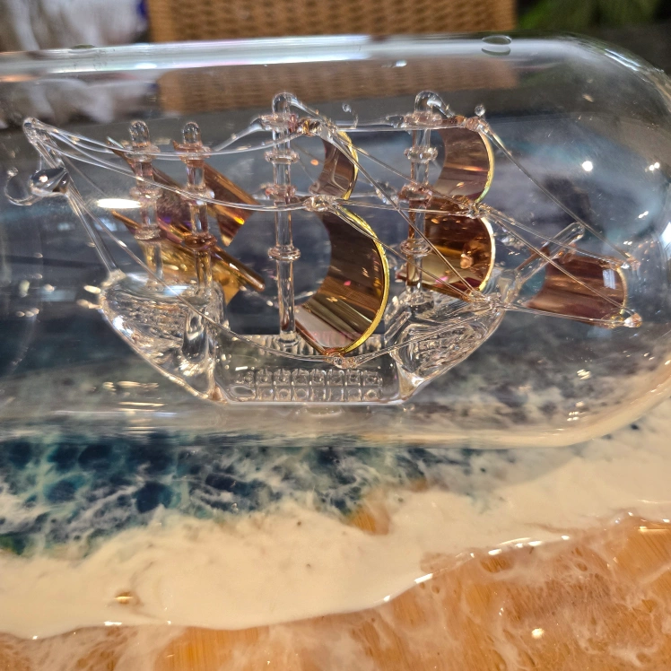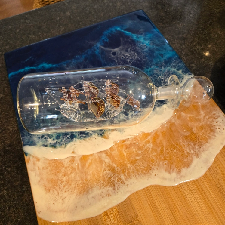 Intricate glass ship inside a clear glass bottle. Unique nautical decor. Perfect for collectors or nautical themed rooms. Subtle iridescent colours.