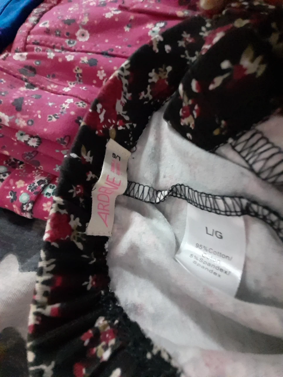Five pairs of women's leggings. Various colours and patterns. Size large. Good condition.Price jens $5 and $6 black and white check pants $5 each,print pants each $5 N Leggings each $5 pick up Markham and Lawrence .