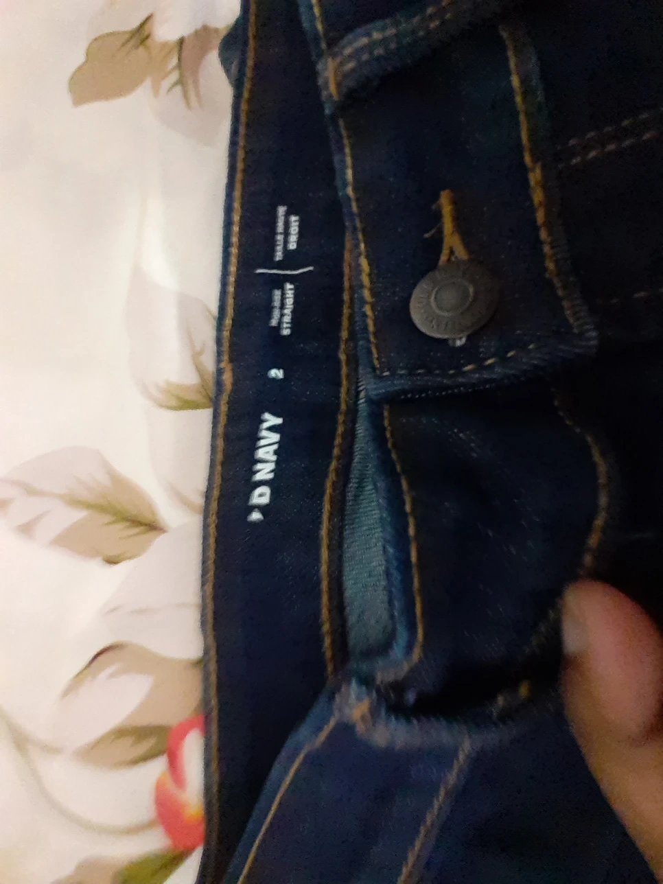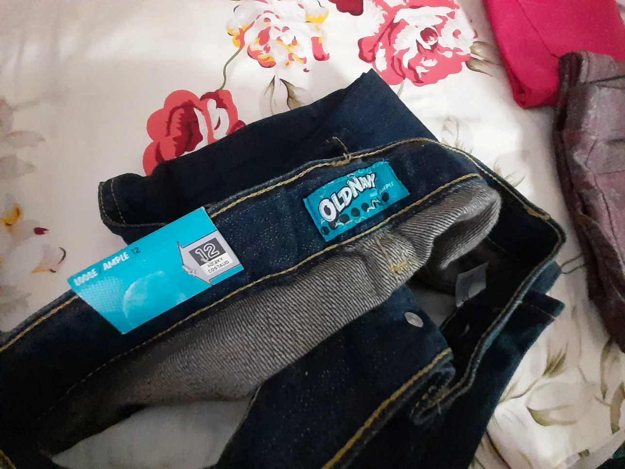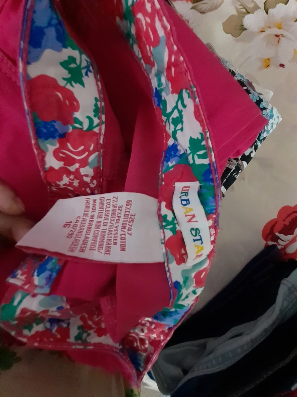 Price started $8 to $10 Three pairs of girls' jeans. Includes one pair of dark wash Old Navy straight leg jeans, size 2. Another pair of dark wash jeans, super skinny, brand Place, size 14. Pink jeans with floral waistband, Urban Star brand, size 16. Pre-owned, good condition.