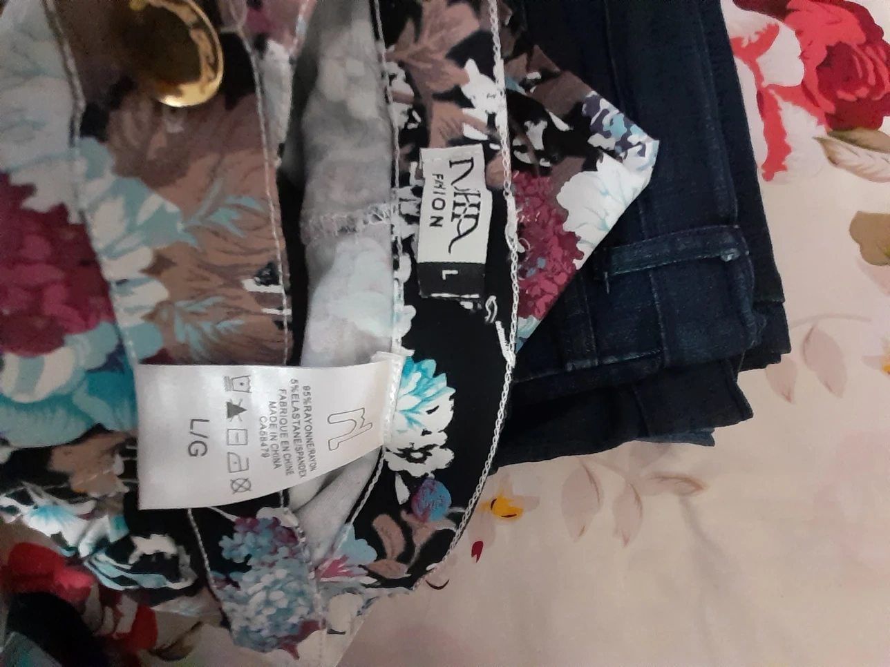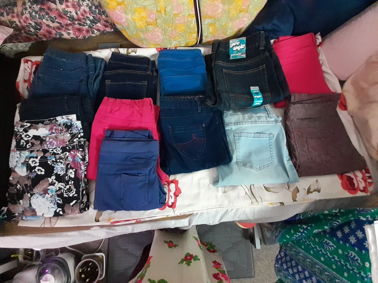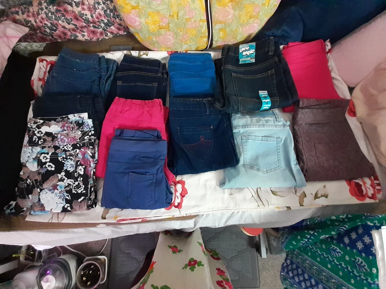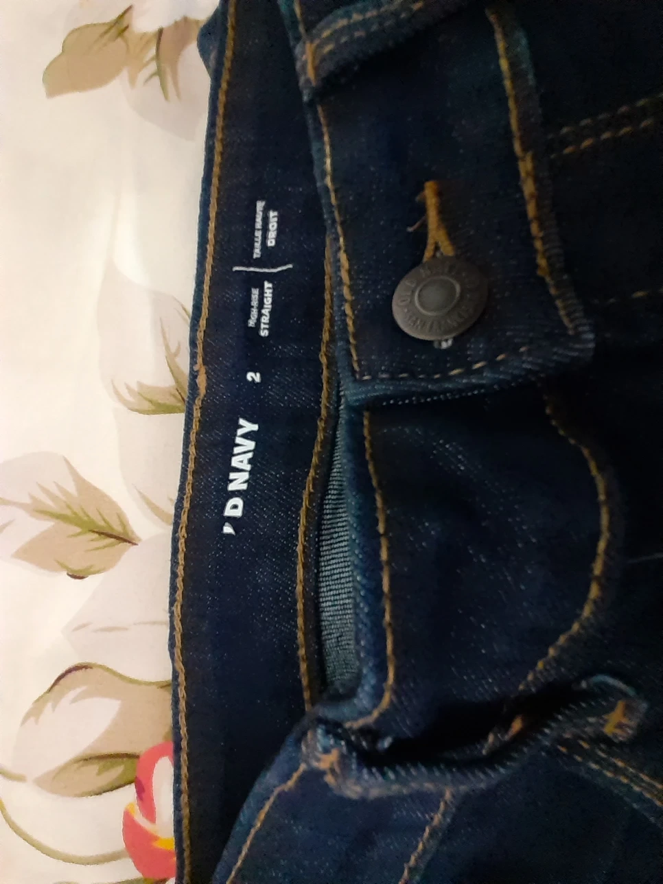 Price started $8 to $10 Three pairs of girls' jeans. Includes one pair of dark wash Old Navy straight leg jeans, size 2. Another pair of dark wash jeans, super skinny, brand Place, size 14. Pink jeans with floral waistband, Urban Star brand, size 16. Pre-owned, good condition.