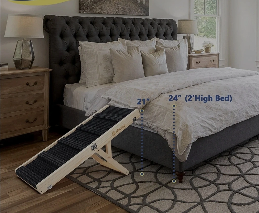 BNIB Brand New In Box 5 adjustable height settings up to 21 Inches Constructed from natural pine solid wood Support pets weighing up to 45lbs Safe Gradual Incline 5 anti-slip crossbars made of high-traction fabric to prevent slips or falls while climbing Foldable design Rounded-edge design ensures it's safe for pets and young children, preventing injuries in case of accidental bumps ***Please Check Out My Other Ads