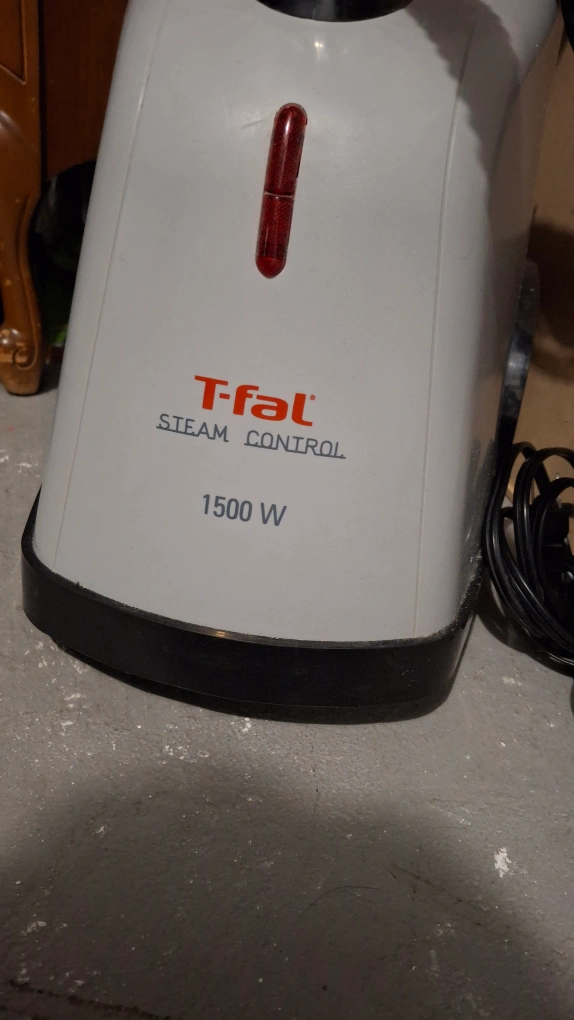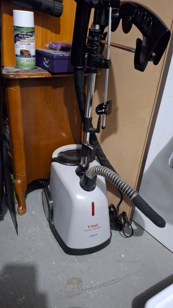 Tefal garment steamer. 1500W. Powerful steam. Good for clothes and other fabrics. Includes a long hose and adjustable height.
