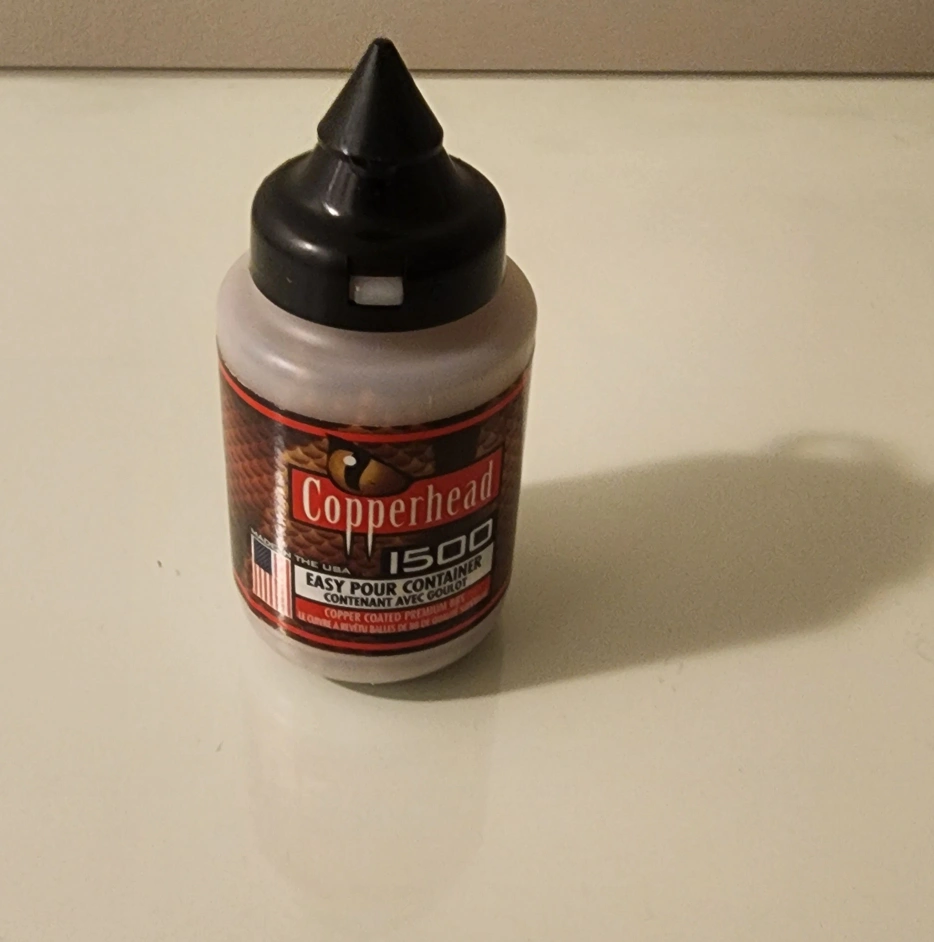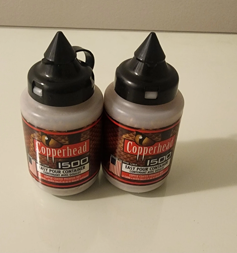 Two containers of Copperhead 1500 airgun pellets. Copper coated premium pellets. Easy pour container.