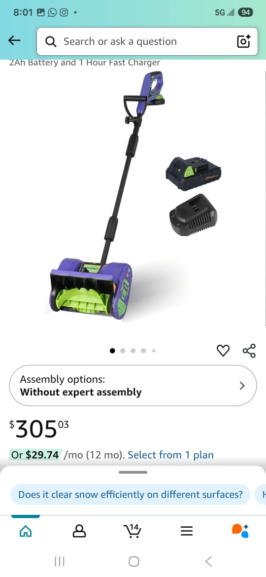 Electric snow thrower. Includes 2Ah battery and 1-hour fast charger. Unassembled.