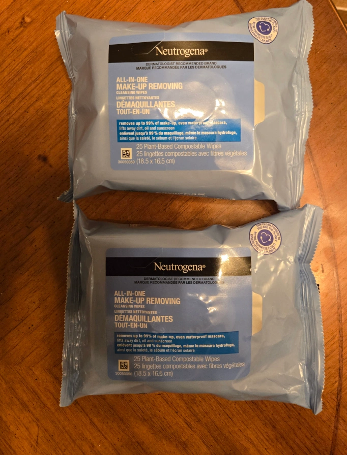 Two packs of Neutrogena Plant-Based Compostable Wipes. Removes up to 99% of make-up, even waterproof mascara. 25 wipes per pack.