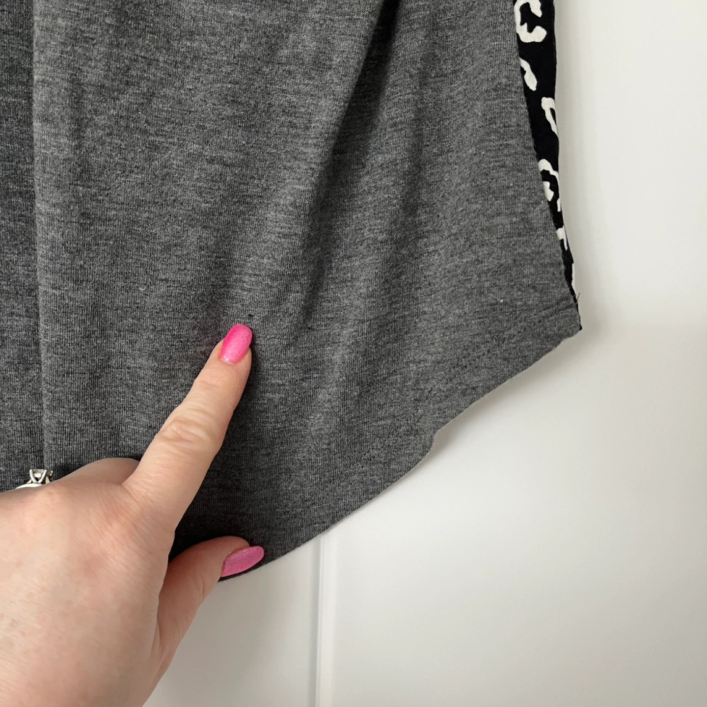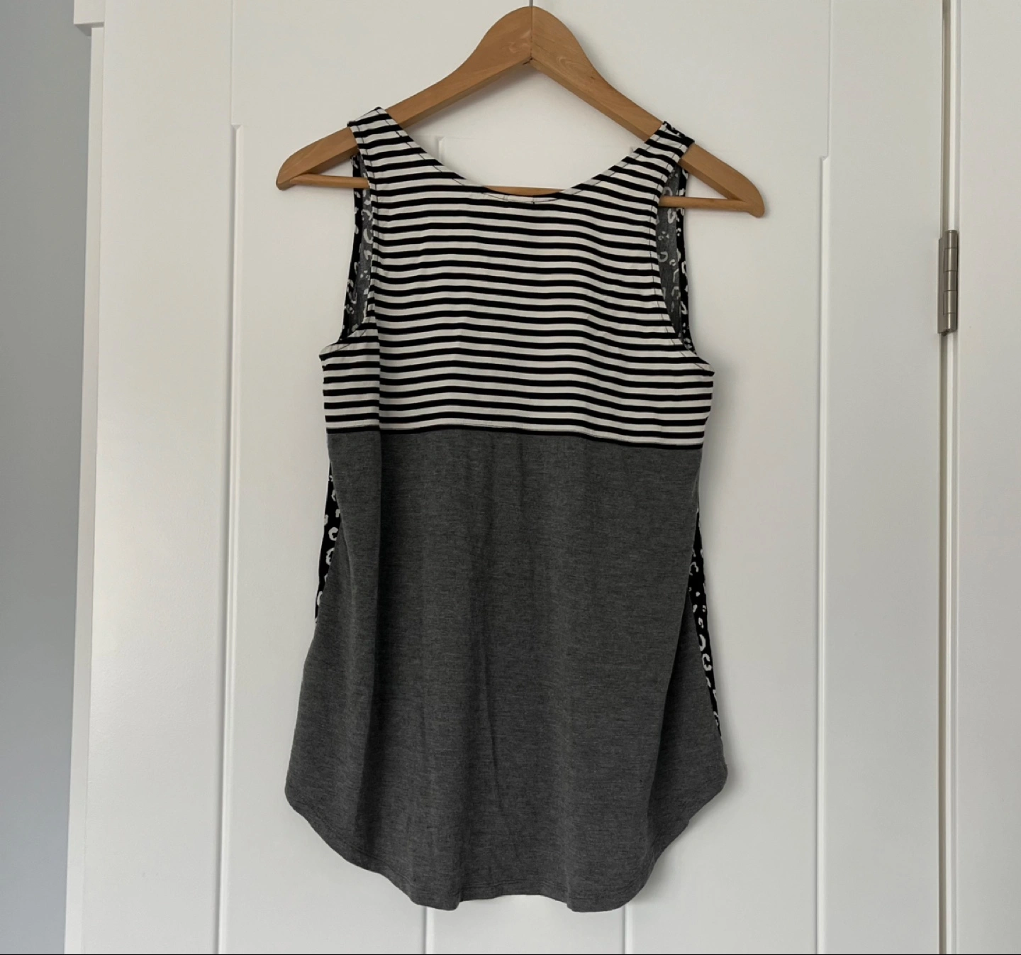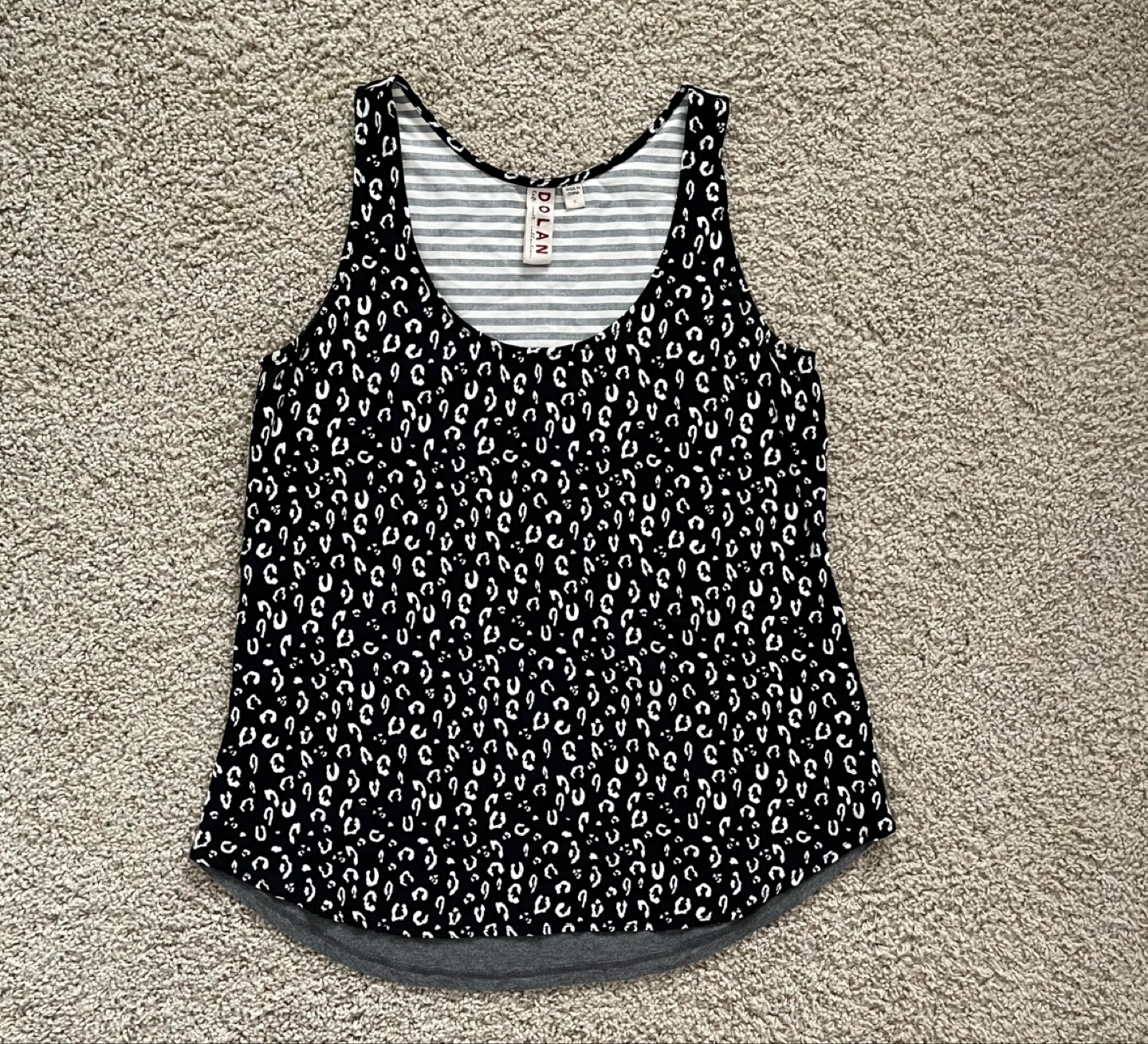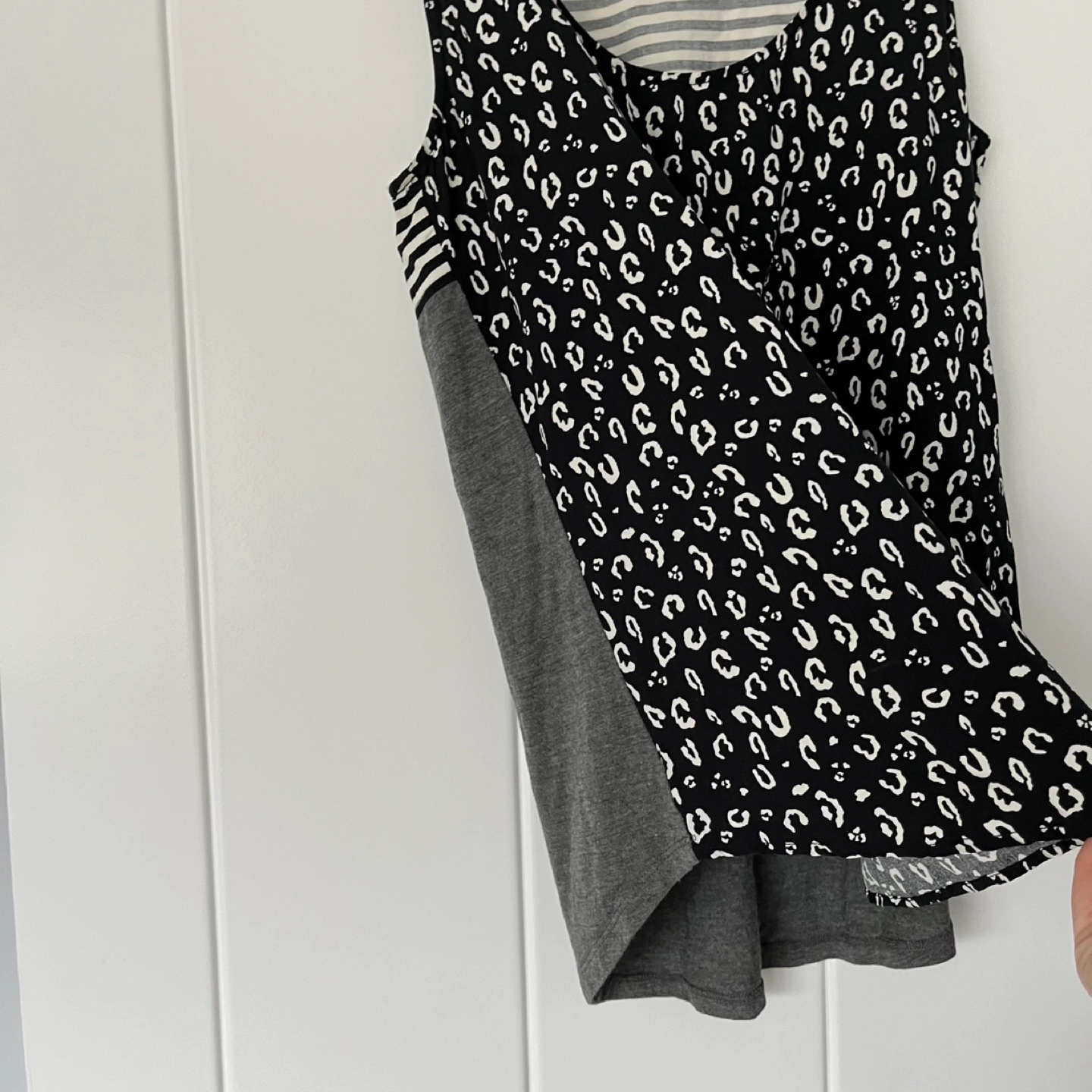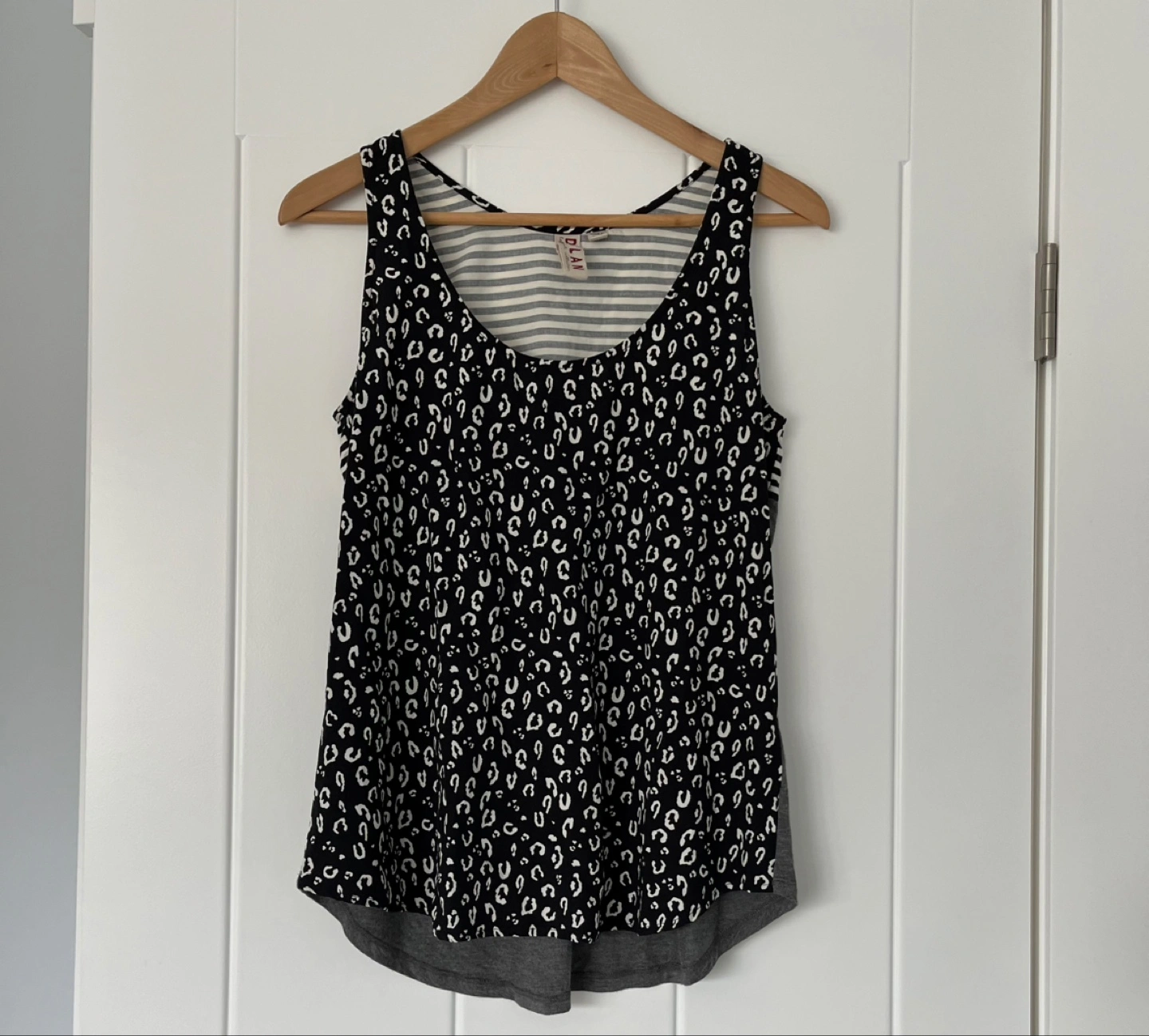 Black and white animal print sleeveless top. Features a grey bottom and a striped yoke. Size small.