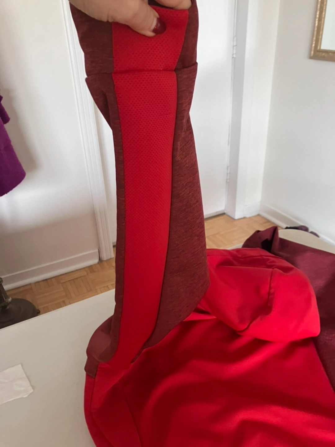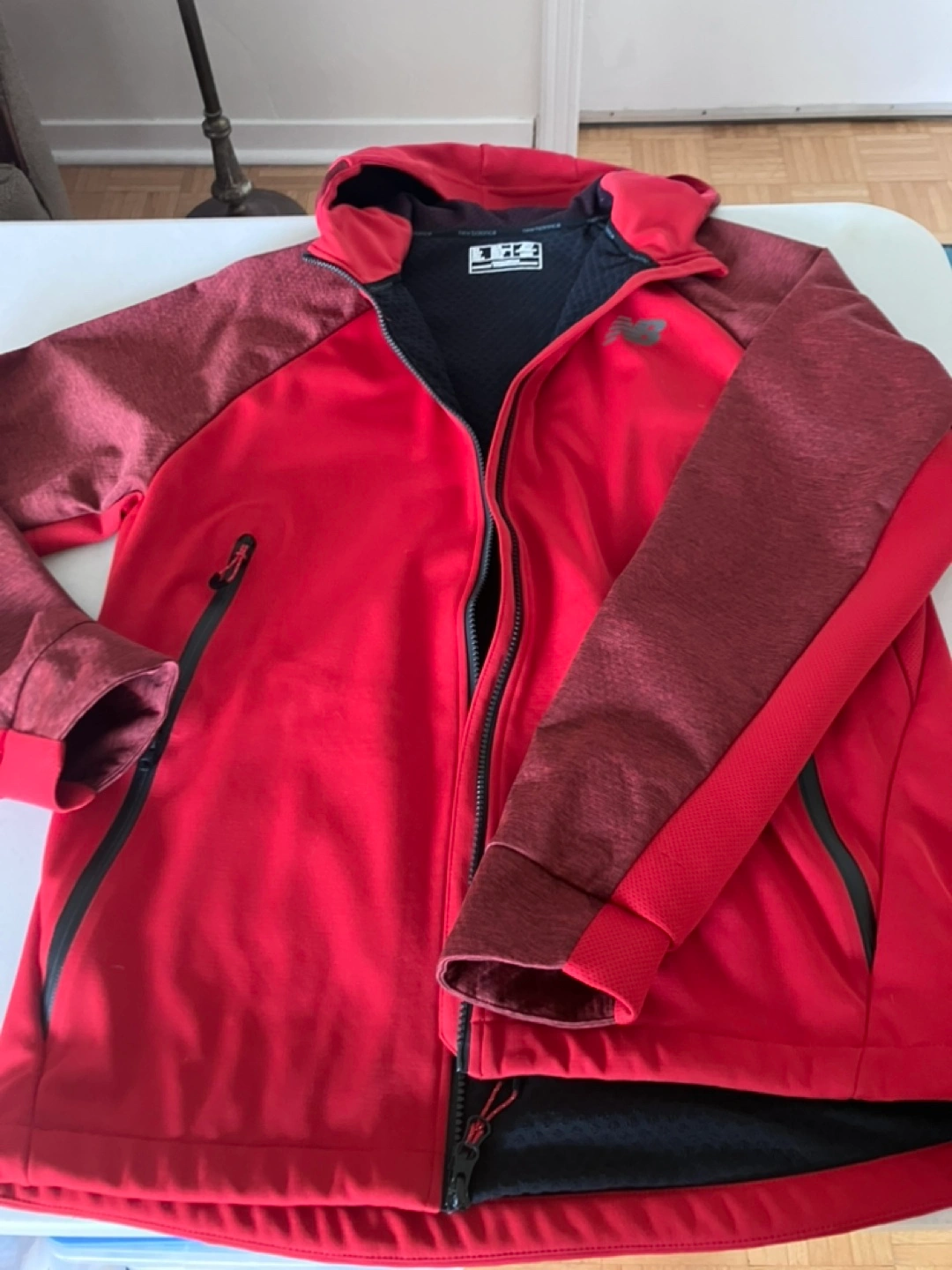 Men's size large New Balance softshell jacket. Red with maroon accents. Full zip closure. Hooded. Two zippered pockets. Breathable mesh lining at sleeves.