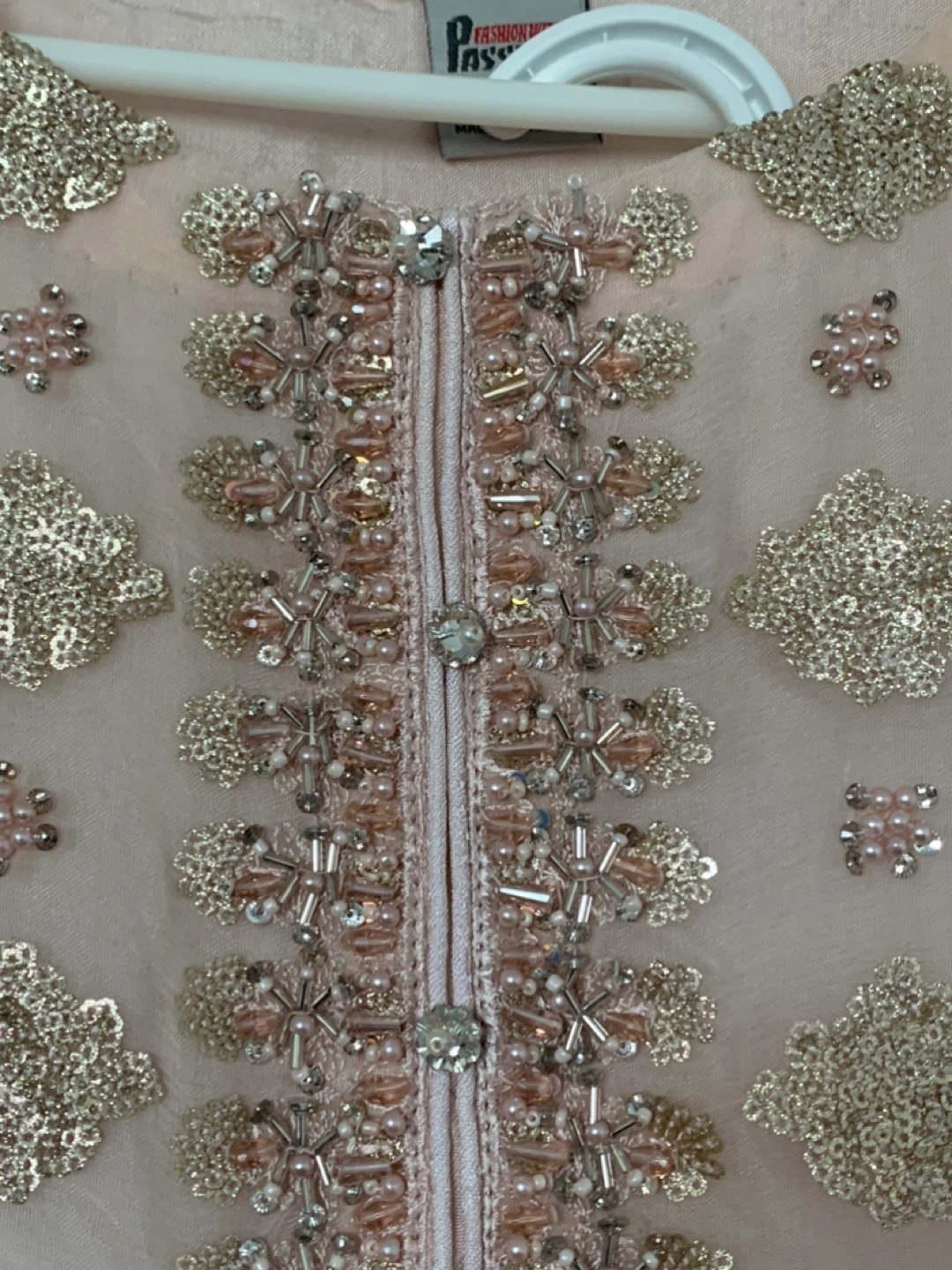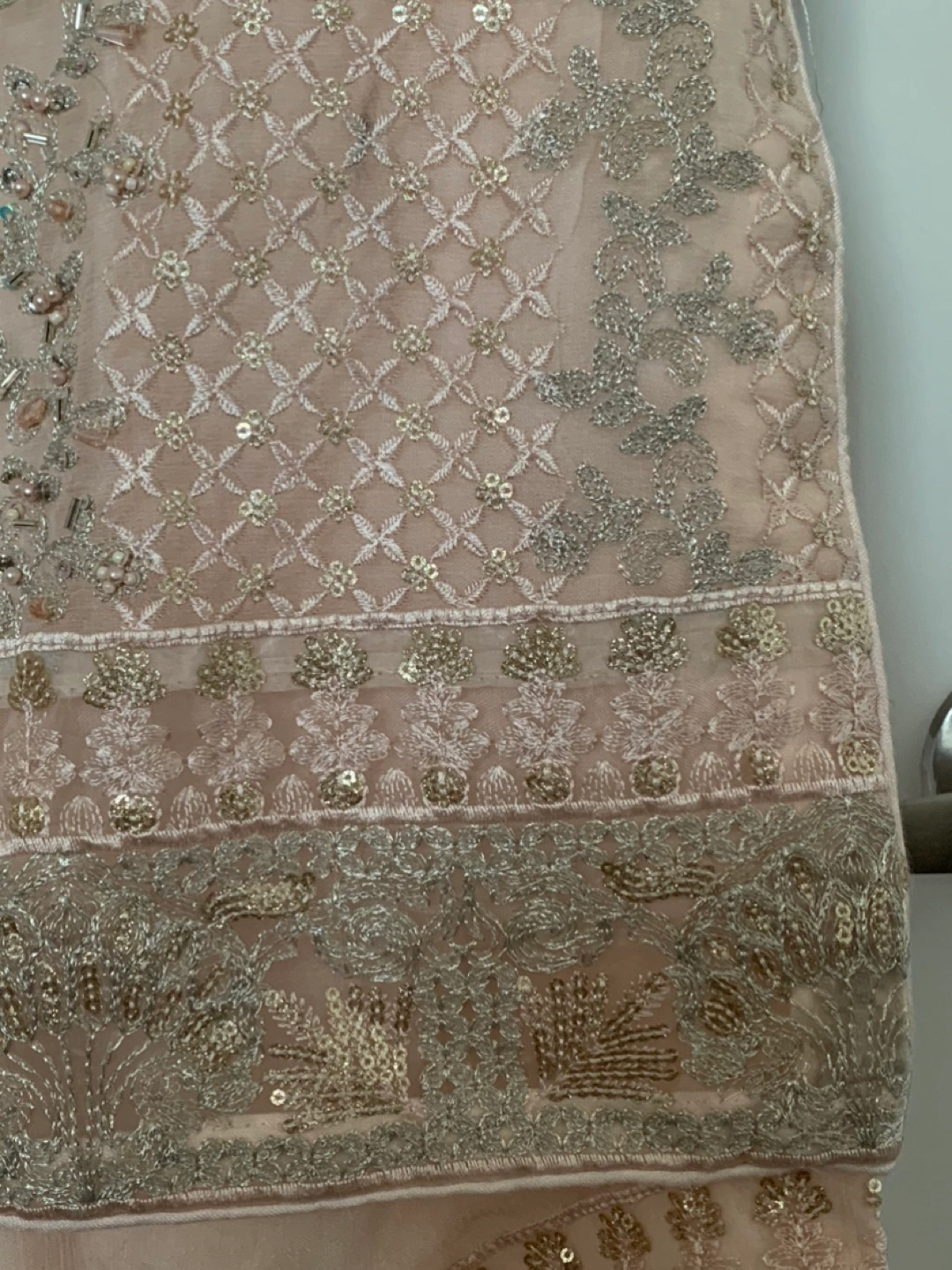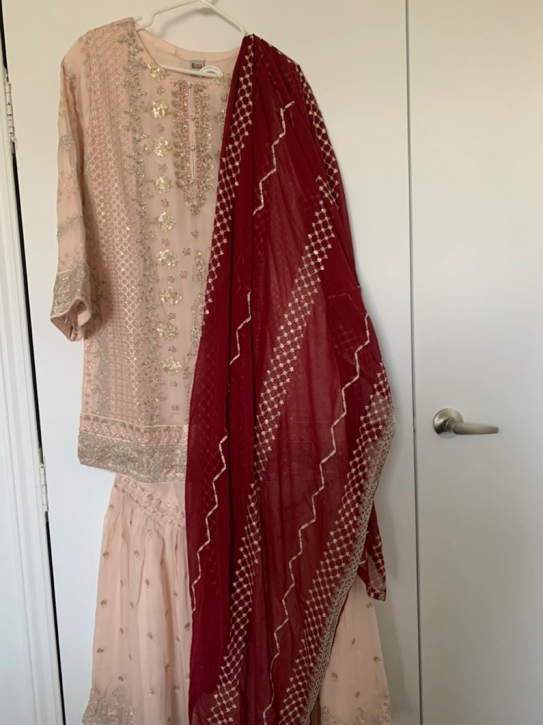 Beautiful three-piece shalwar kameez. Features intricate embroidery and embellishments. Light pink coloured kameez and shalwar. Maroon dupatta with matching embroidery. Perfect for special occasions. Used like new
