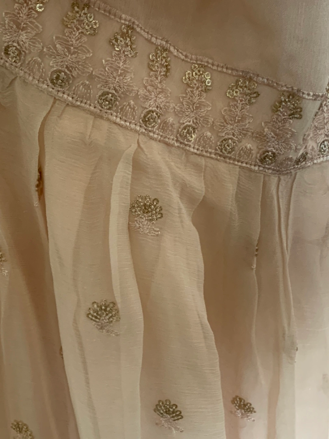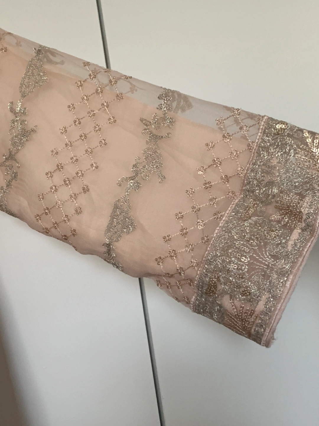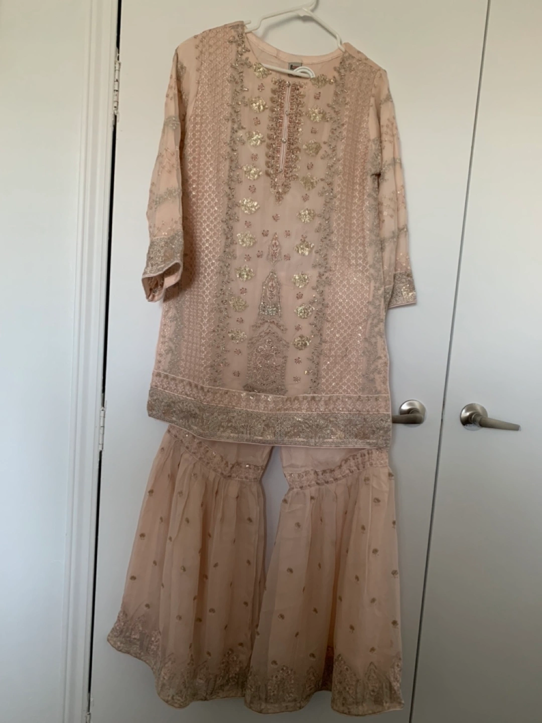 Beautiful three-piece shalwar kameez. Features intricate embroidery and embellishments. Light pink coloured kameez and shalwar. Maroon dupatta with matching embroidery. Perfect for special occasions. Used like new