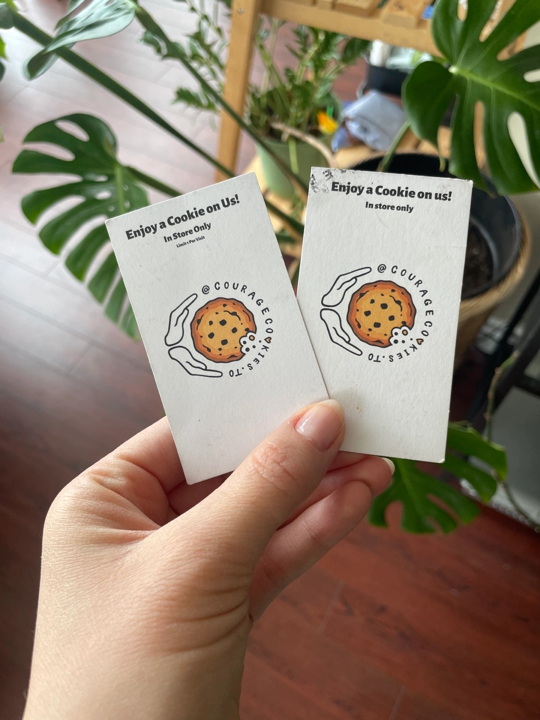 Two coupons for a free cookie at Courage Cookies. Valid in-store only, limit one per visit. No expiration!