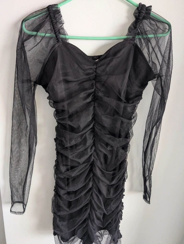 Cute black mini dress. Features long sheer sleeves and a ruched bodice. Perfect for a night out.