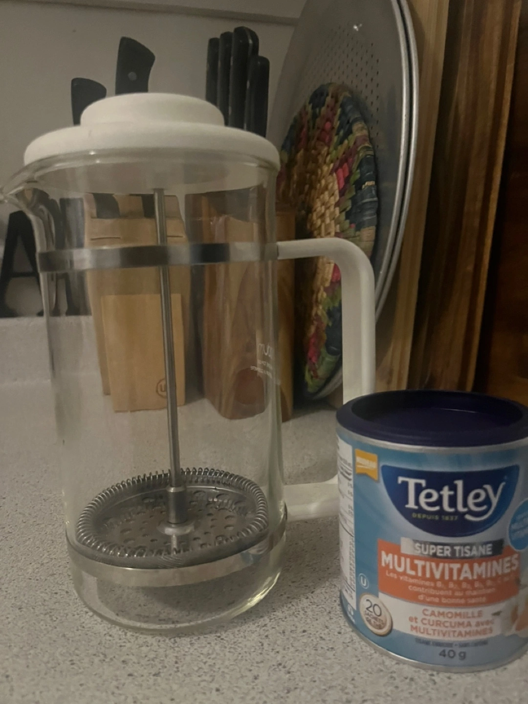 Glass French press coffee maker. White plastic lid and handle. Metal filter and plunger. Great for making coffee or tea. Tea added to demonstrate size. Believe it is 17oz