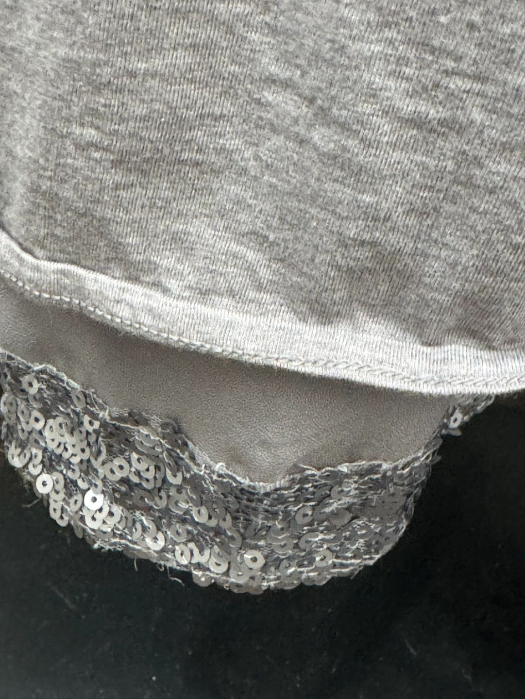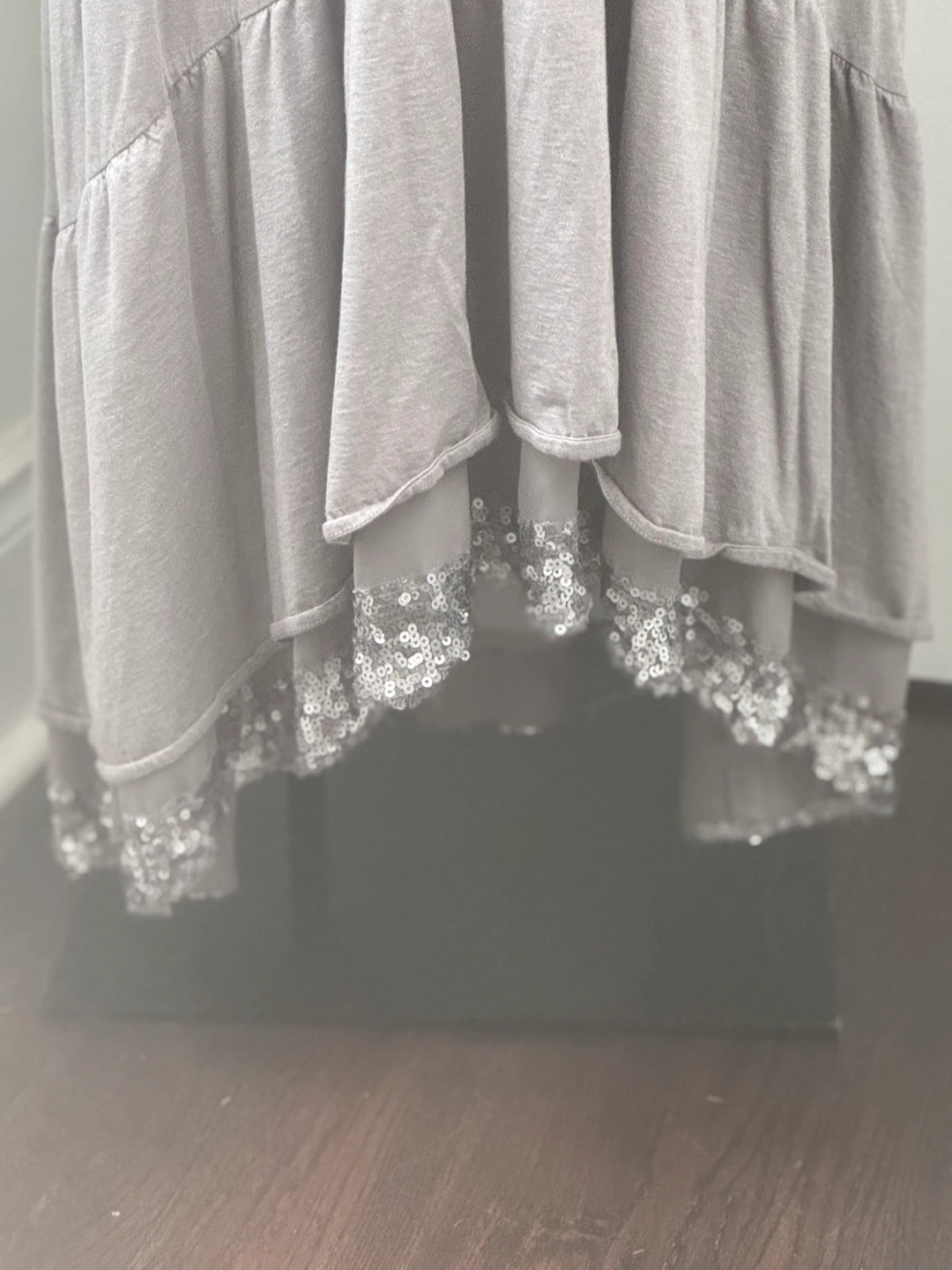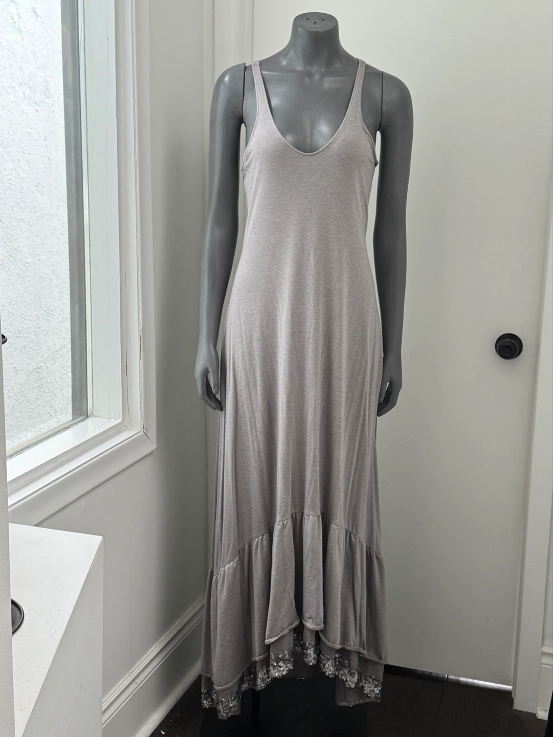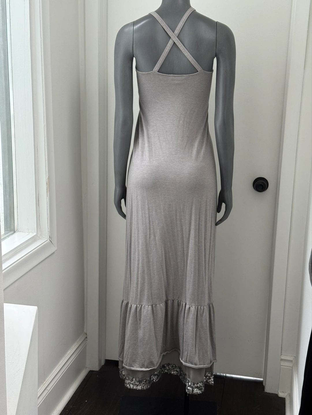 Beautiful grey maxi dress. Features a tiered, ruffled hemline. Sequined detailing along the bottom. Relaxed, comfortable fit. Cross-back straps. Never worn. Paid 250usd