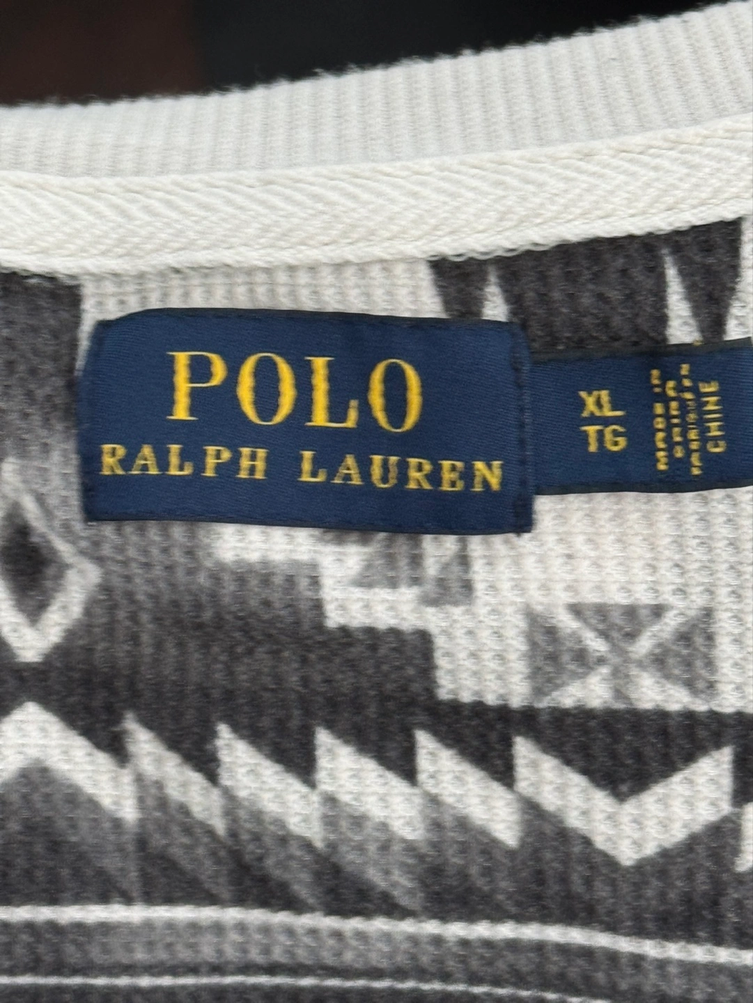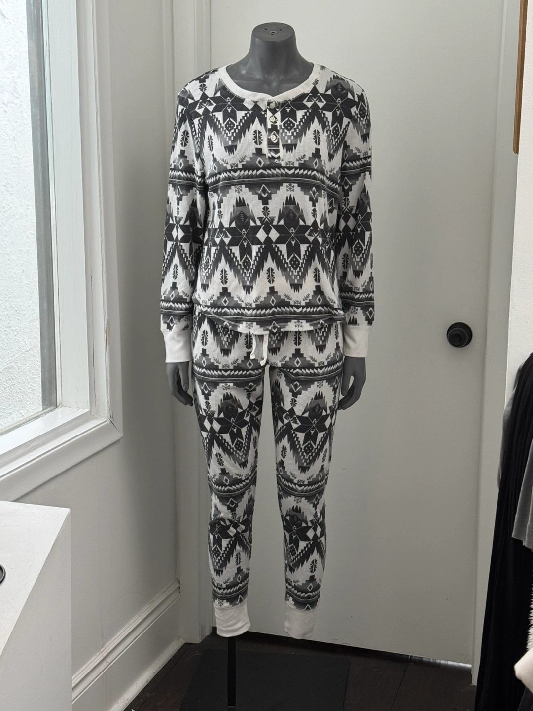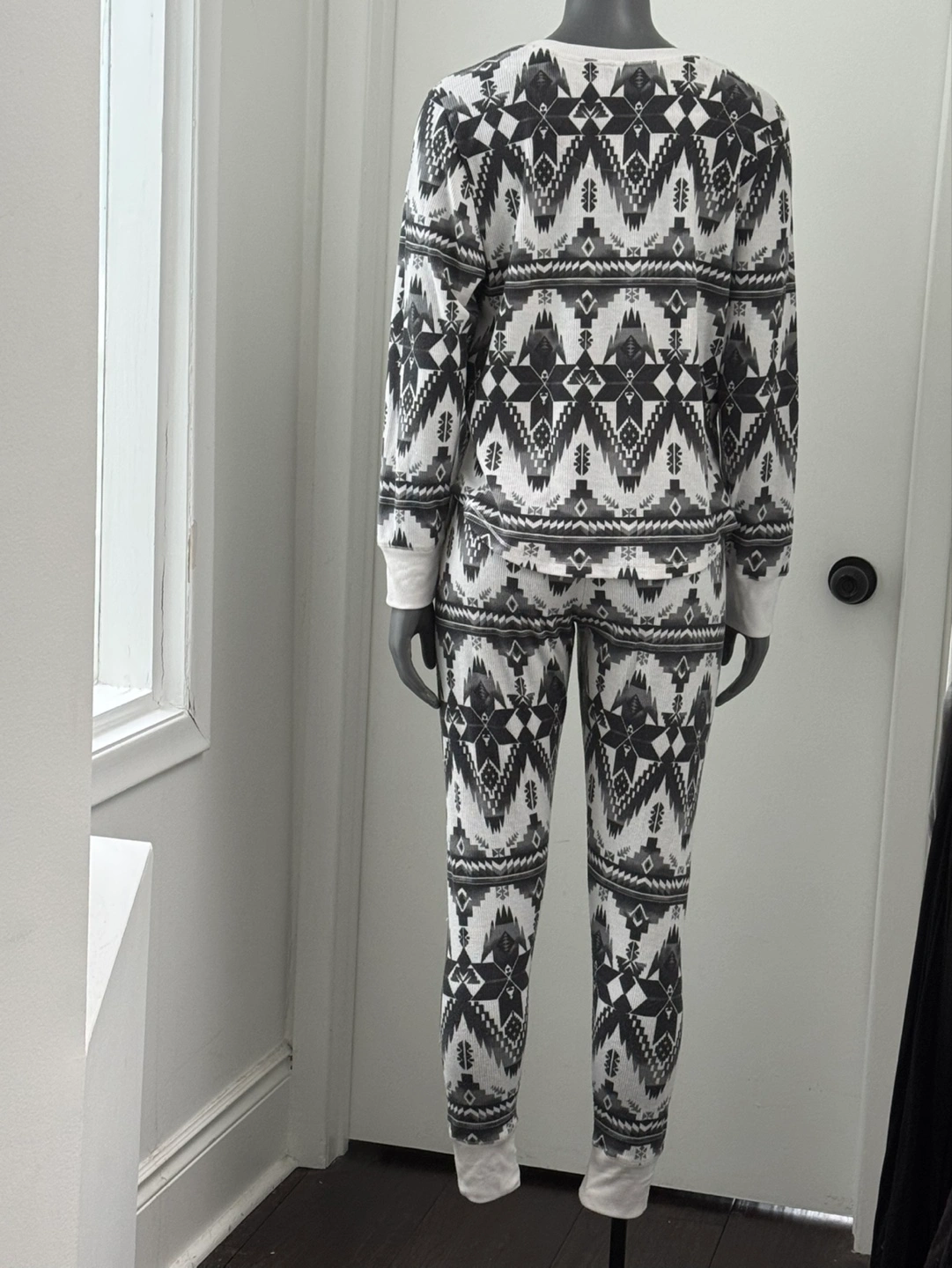 Women’s size medium Polo Ralph Lauren lounge set. Features a black and white Southwestern-inspired pattern. Waffle knit fabric. Long sleeves and pants. Button-up top (XL) and pants (M). Never worn