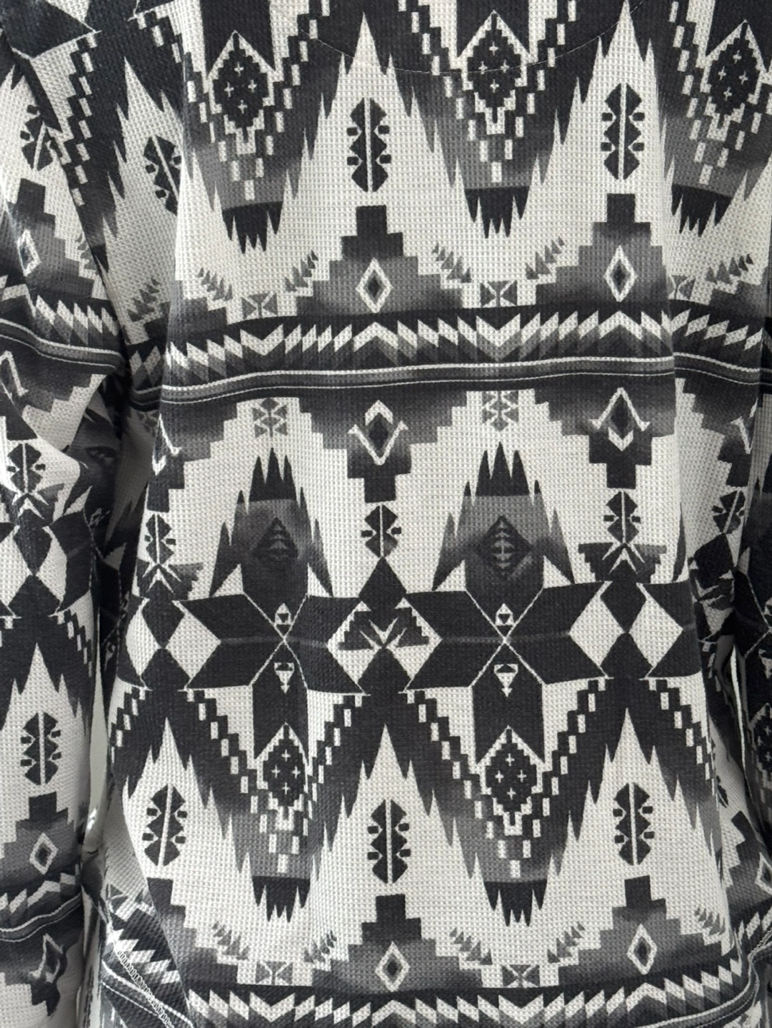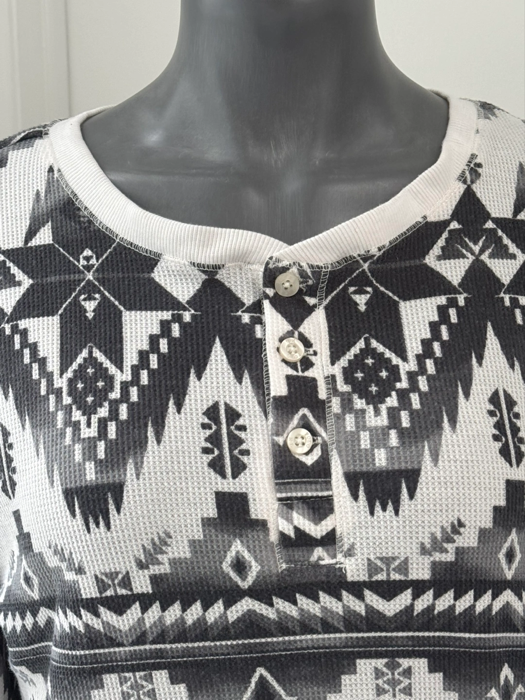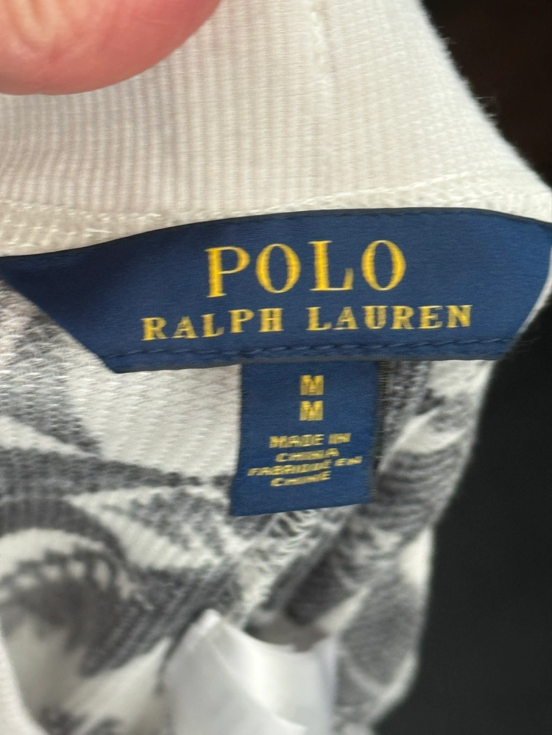 Women’s size medium Polo Ralph Lauren lounge set. Features a black and white Southwestern-inspired pattern. Waffle knit fabric. Long sleeves and pants. Button-up top (XL) and pants (M). Never worn