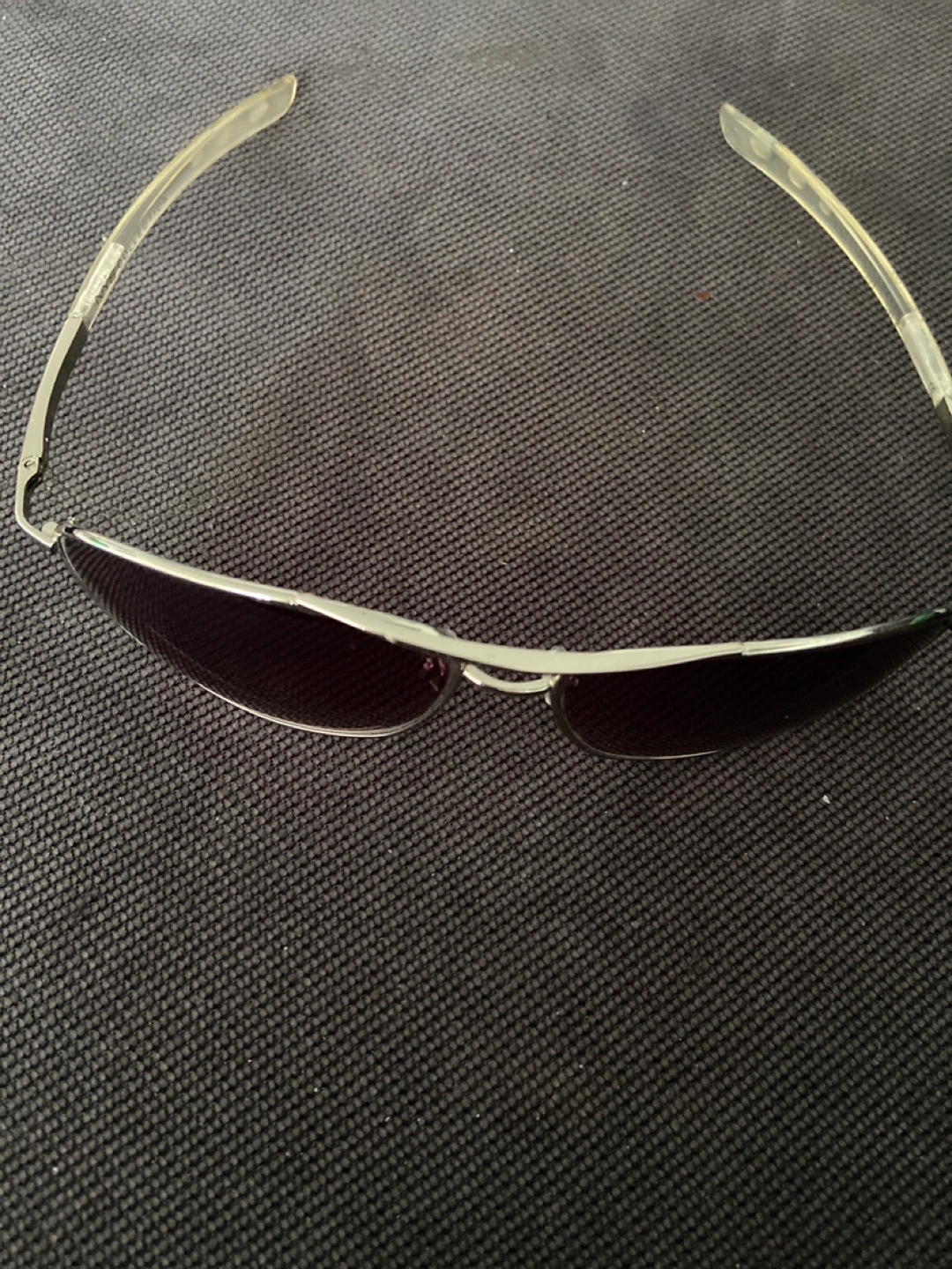 Men's aviator sunglasses. Silver metal frame. Dark grey lenses. Clear plastic temple arms. Pre-owned.